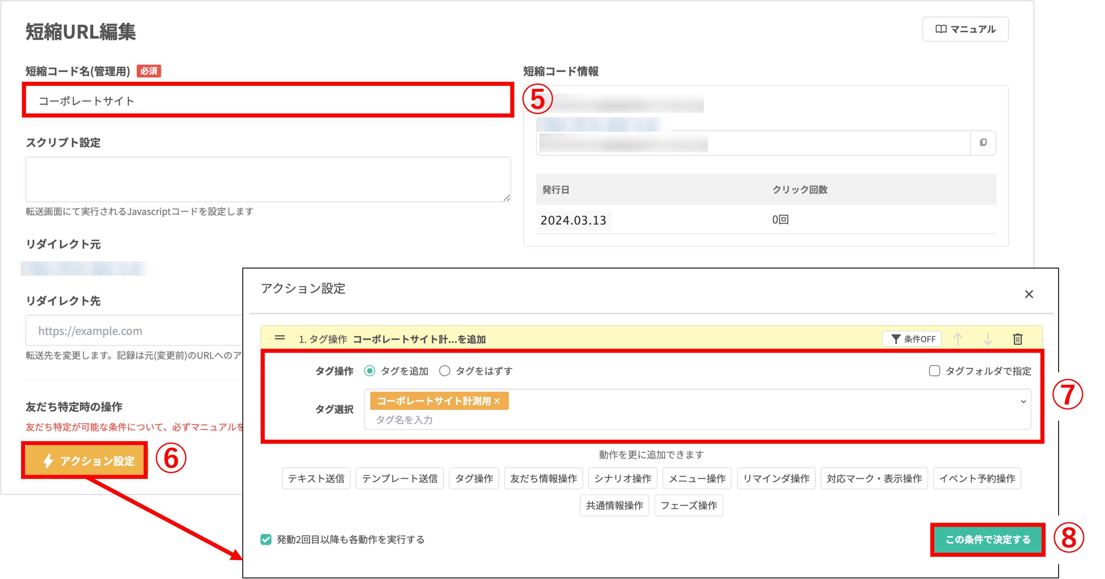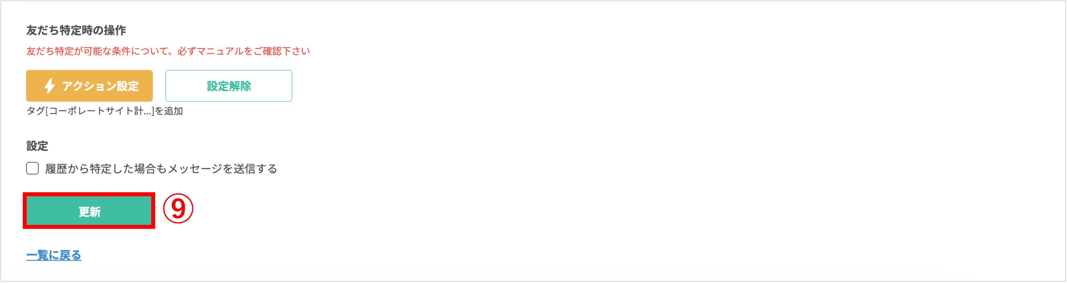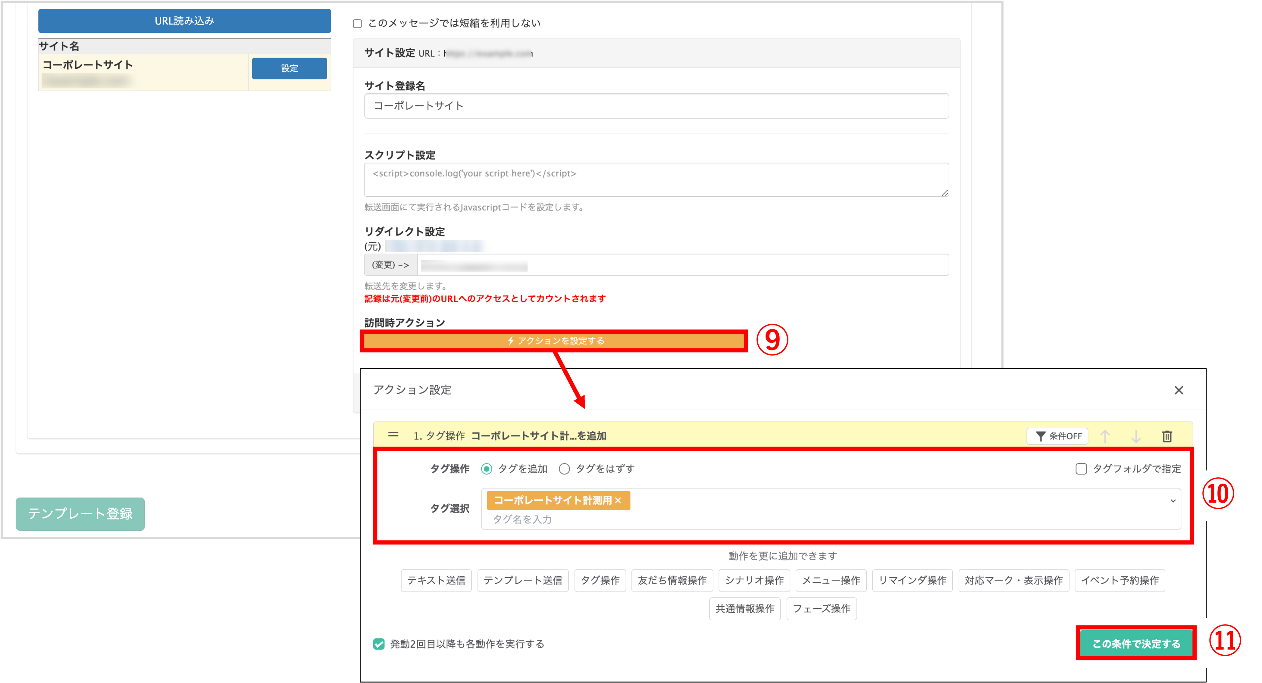 ⑩『タグ操作』で「準備」で作成した【タグを追加】を選択します。