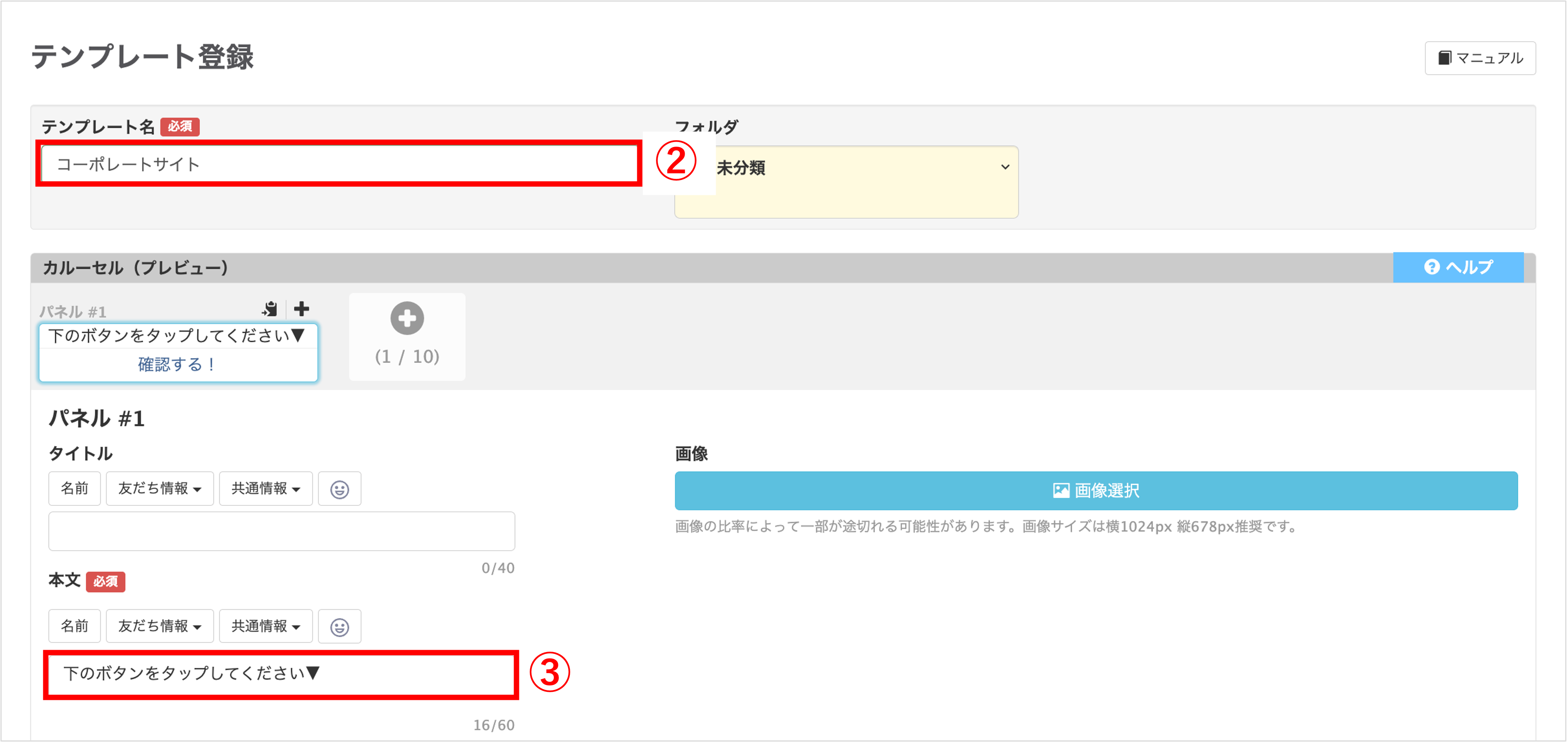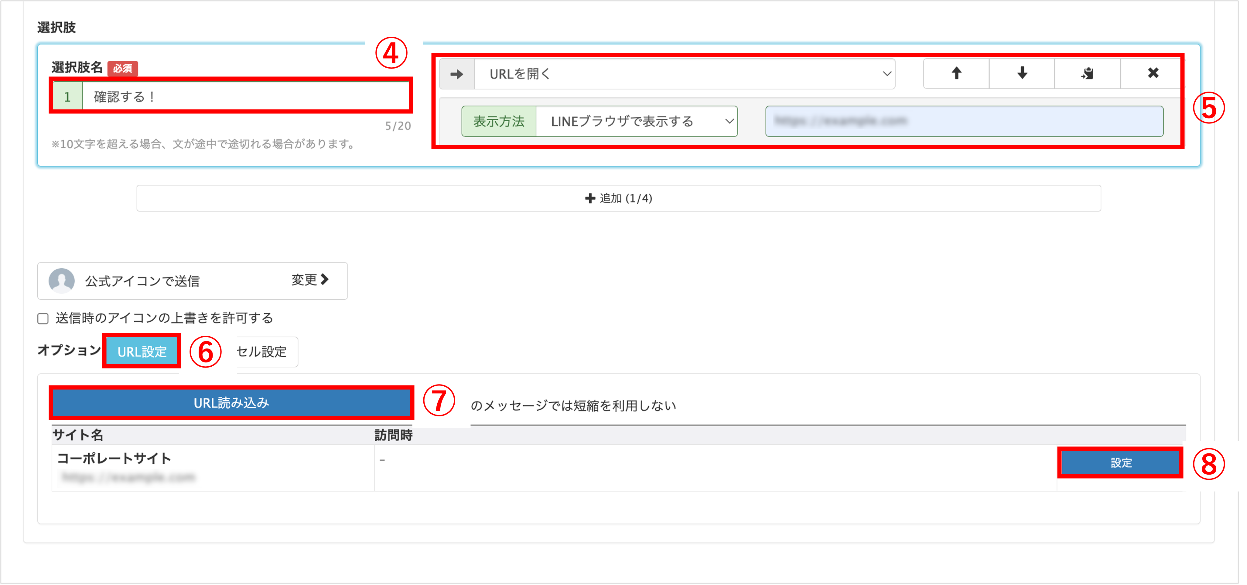 ※カルーセル以外のテンプレートでもテンプレート作成ページの画面下部にある〔URL設定〕ボタンから同じように設定ができます。