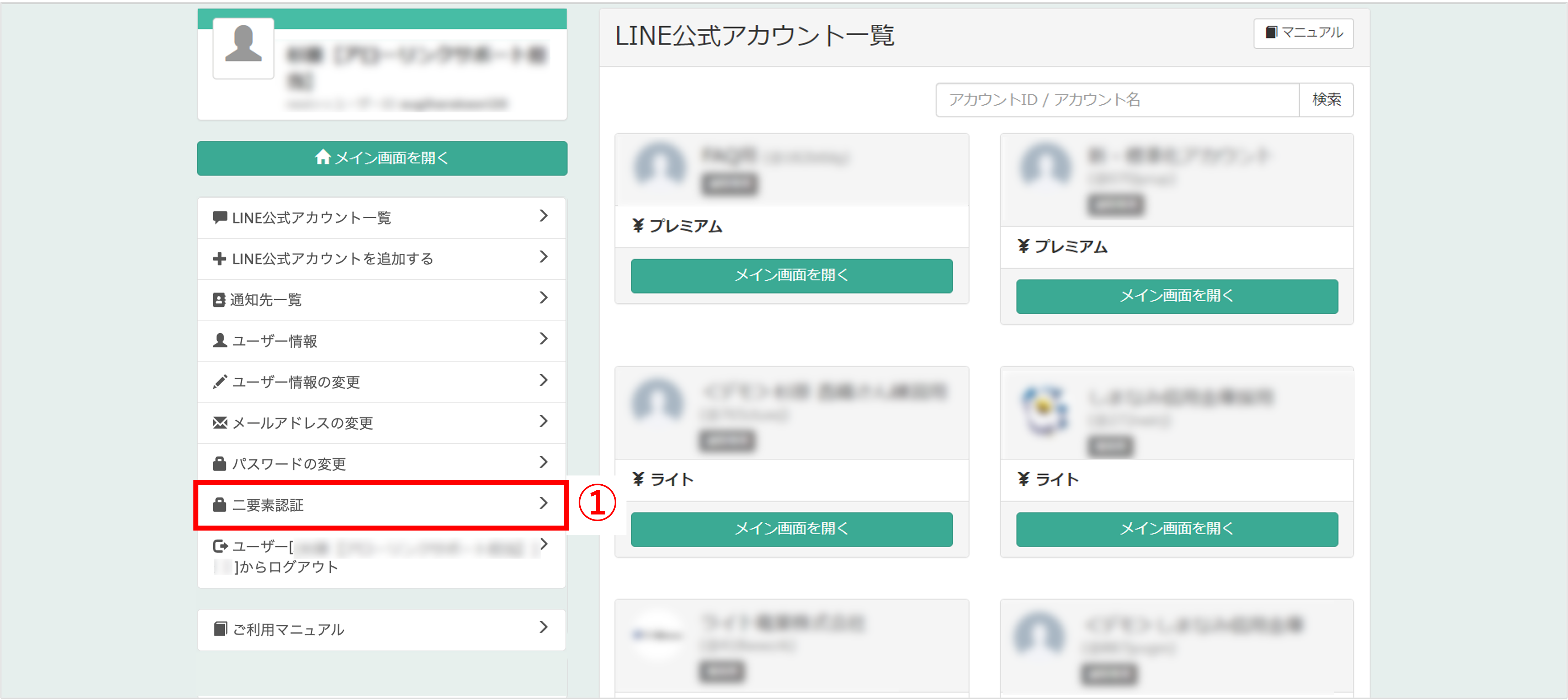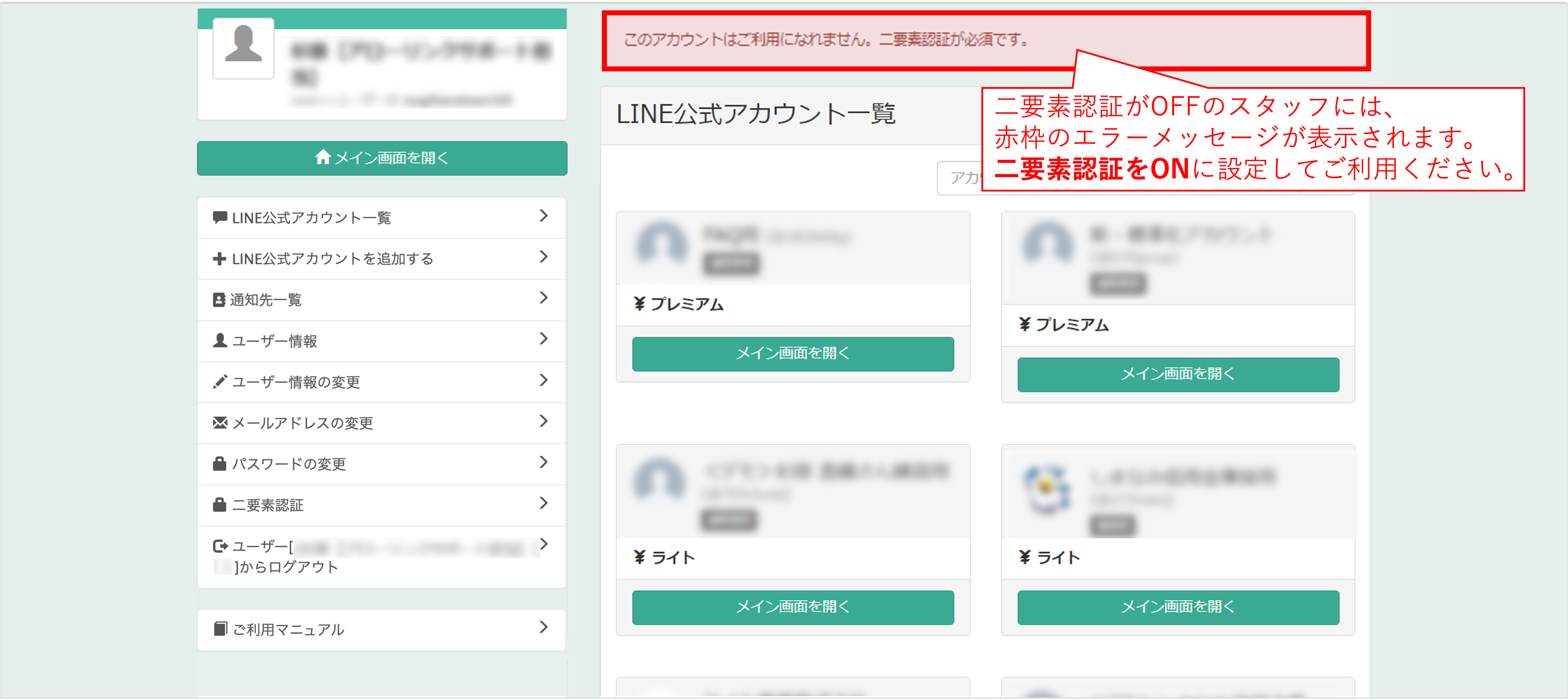 ※アカウントへのアクセスに二要素認証が必須となるため、設定を行う前にスタッフごとに設定する方法の手順でスタッフごとの二要素認証をONにしてください。