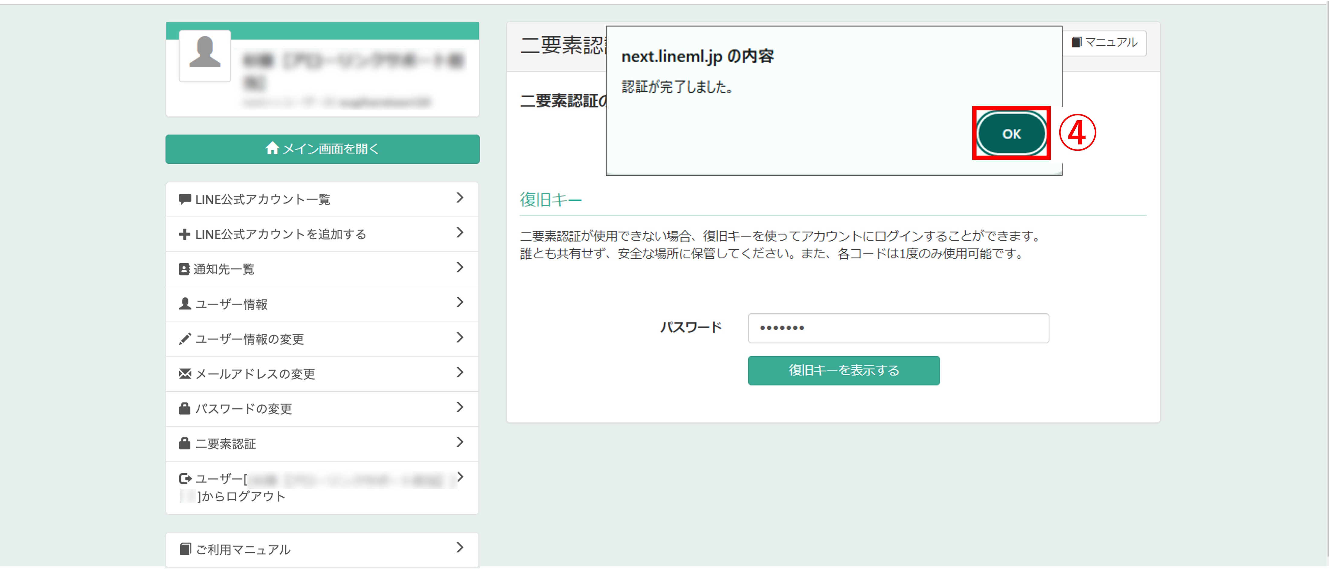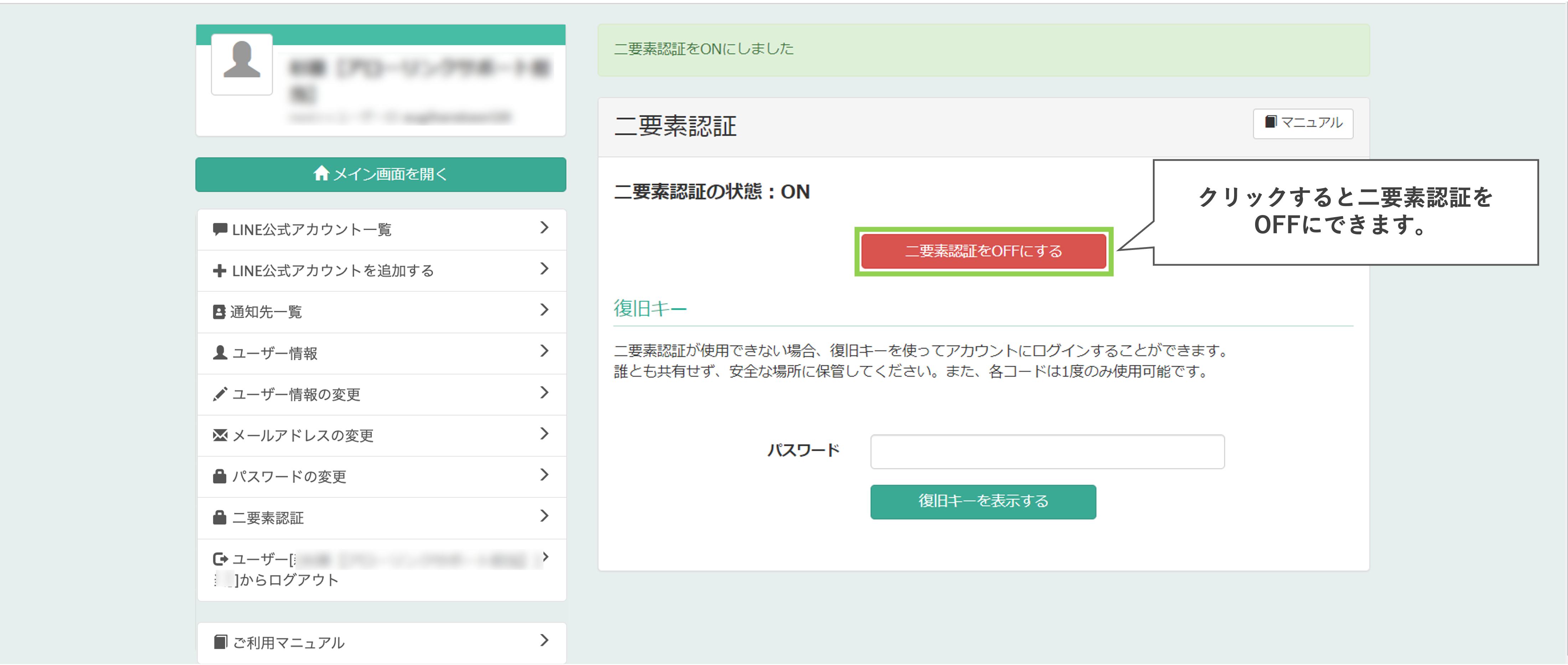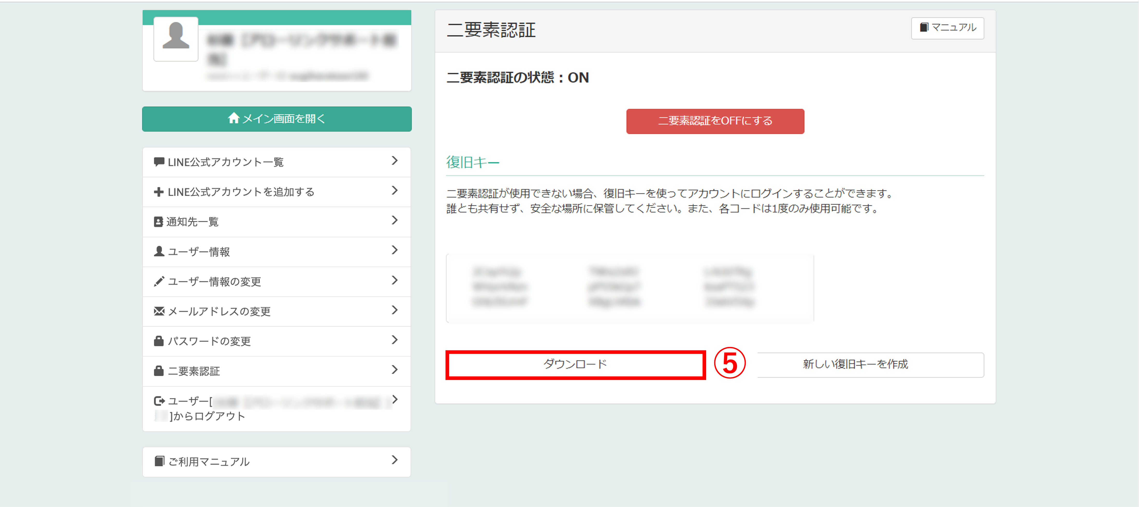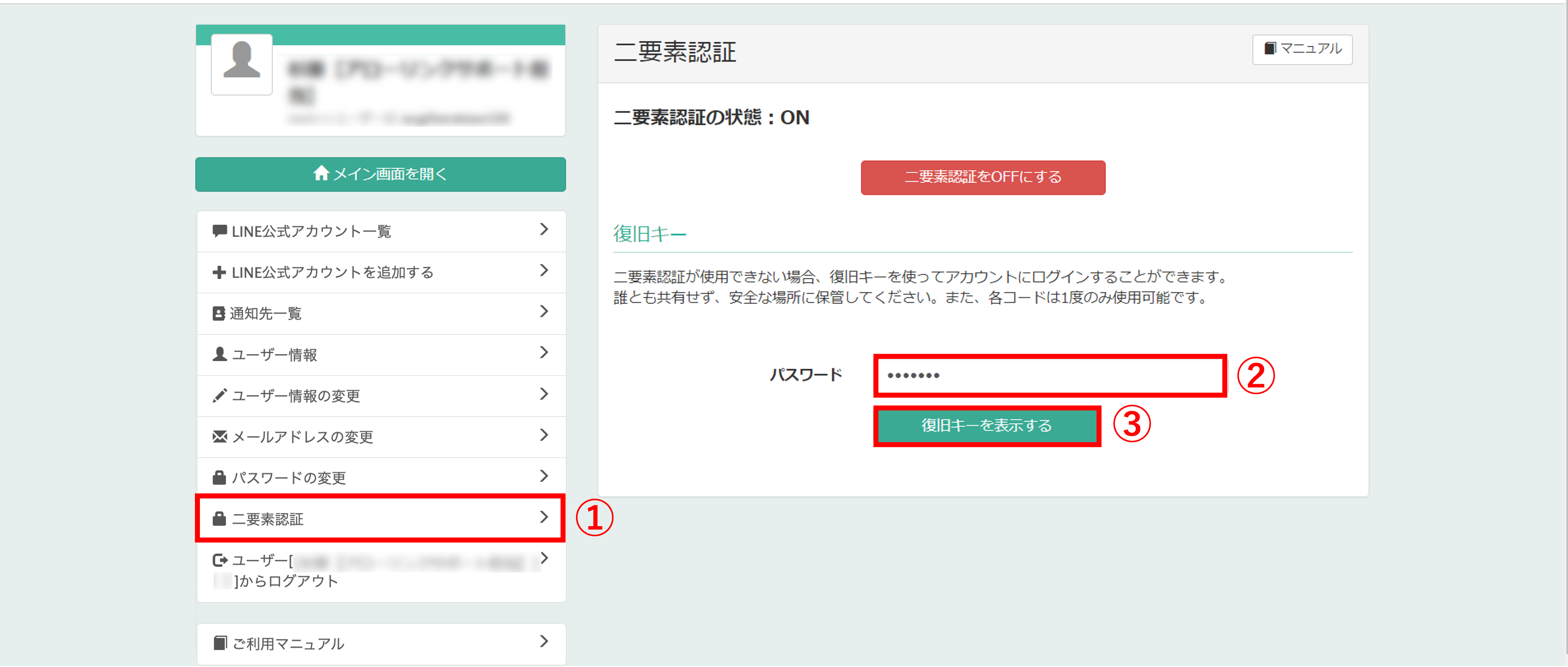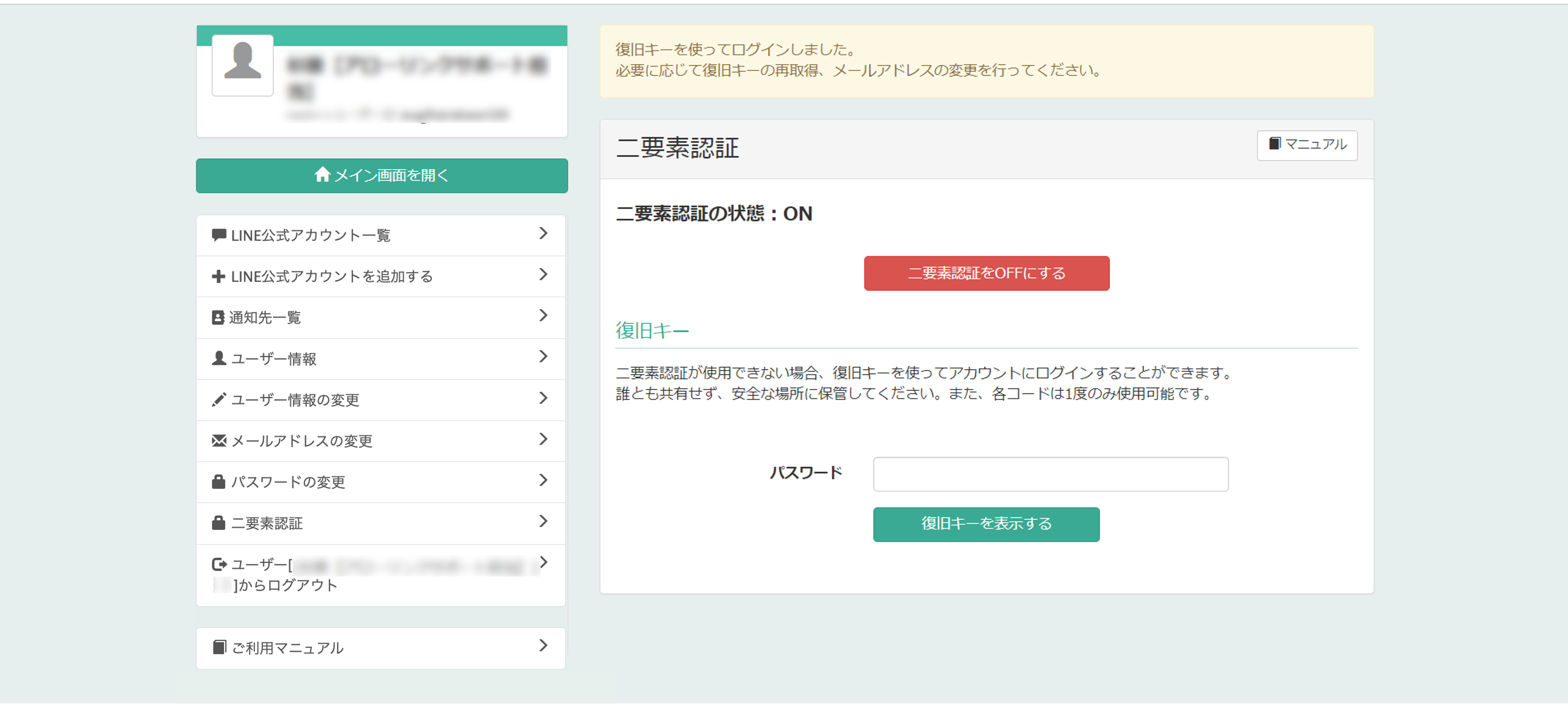 万が一、ログイン時にメールの不具合などで認証コードを受け取れなかった場合でも、「復旧キー」を事前に取得しておくことで、別の方法でログインすることが可能です。設定後は復旧キーを必ず保存しておくことをおすすめします。