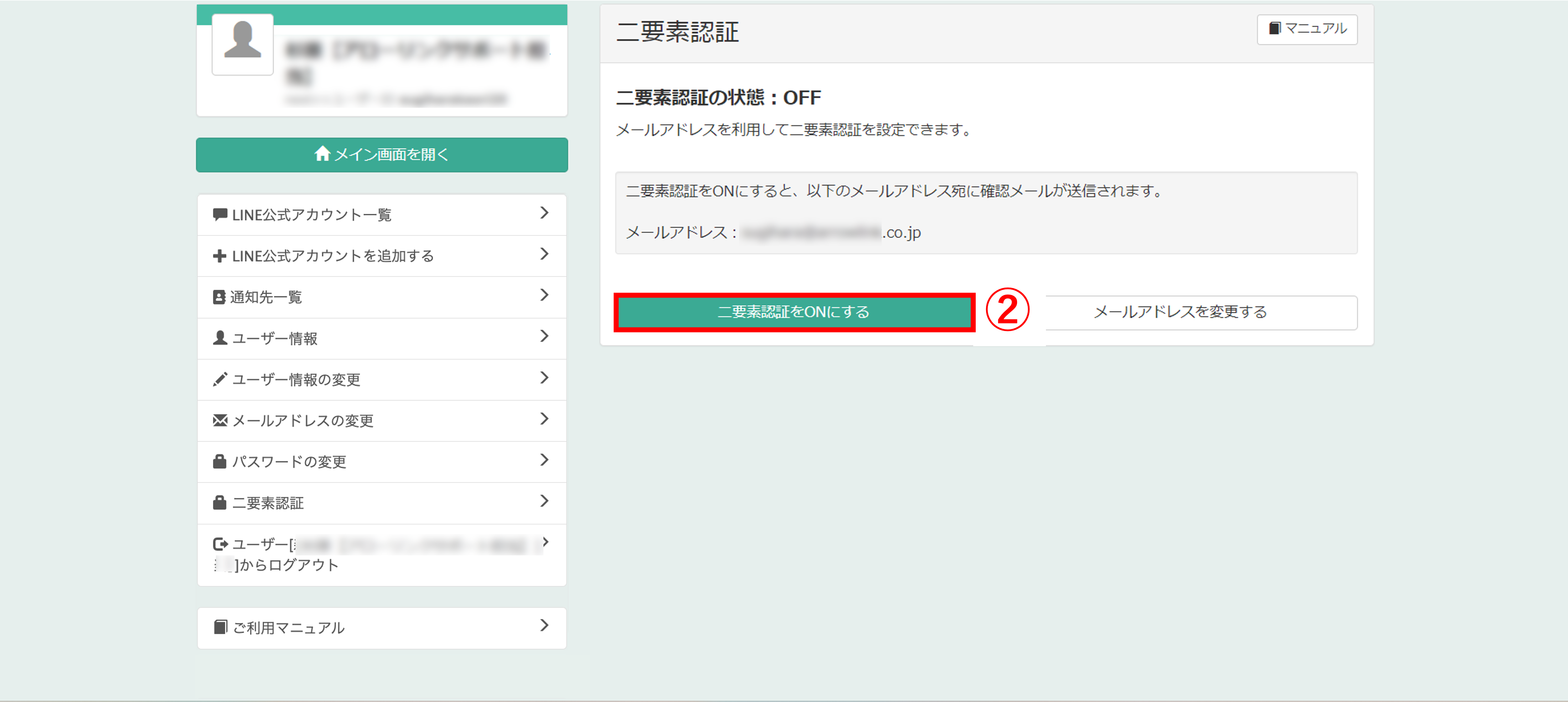 ②〔二要素認証を必須にする〕ボタンをクリックします。