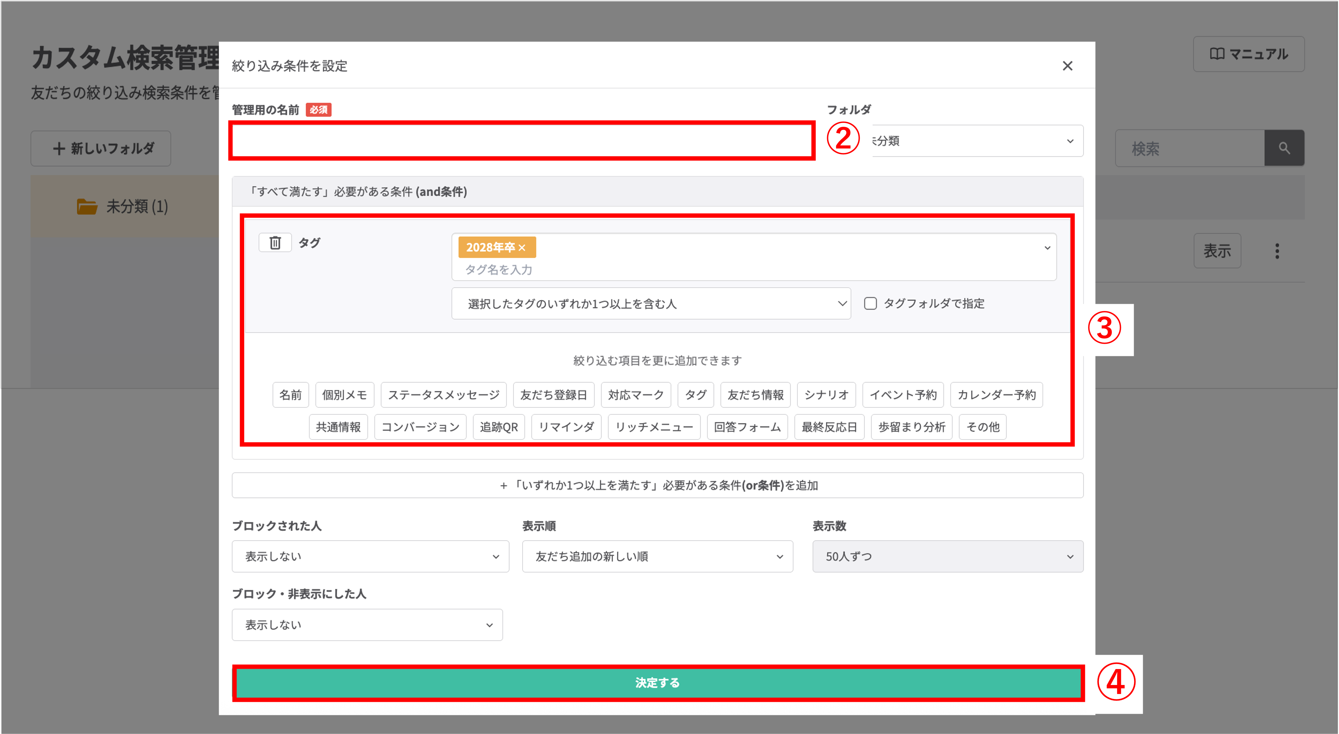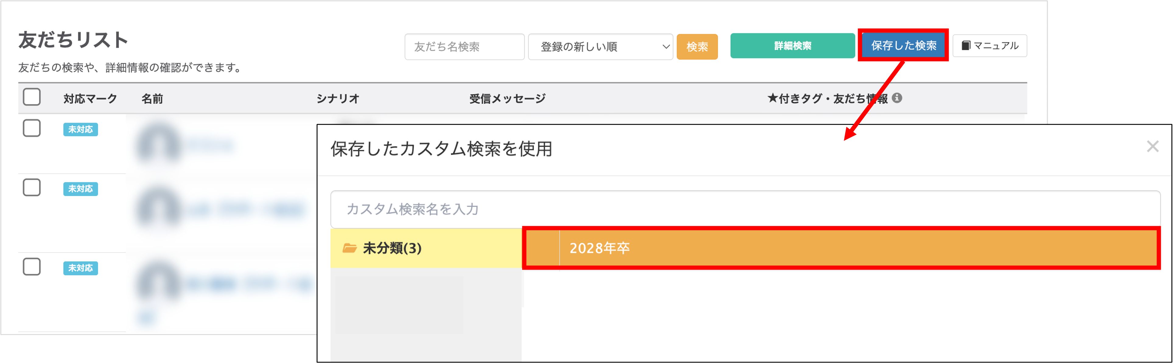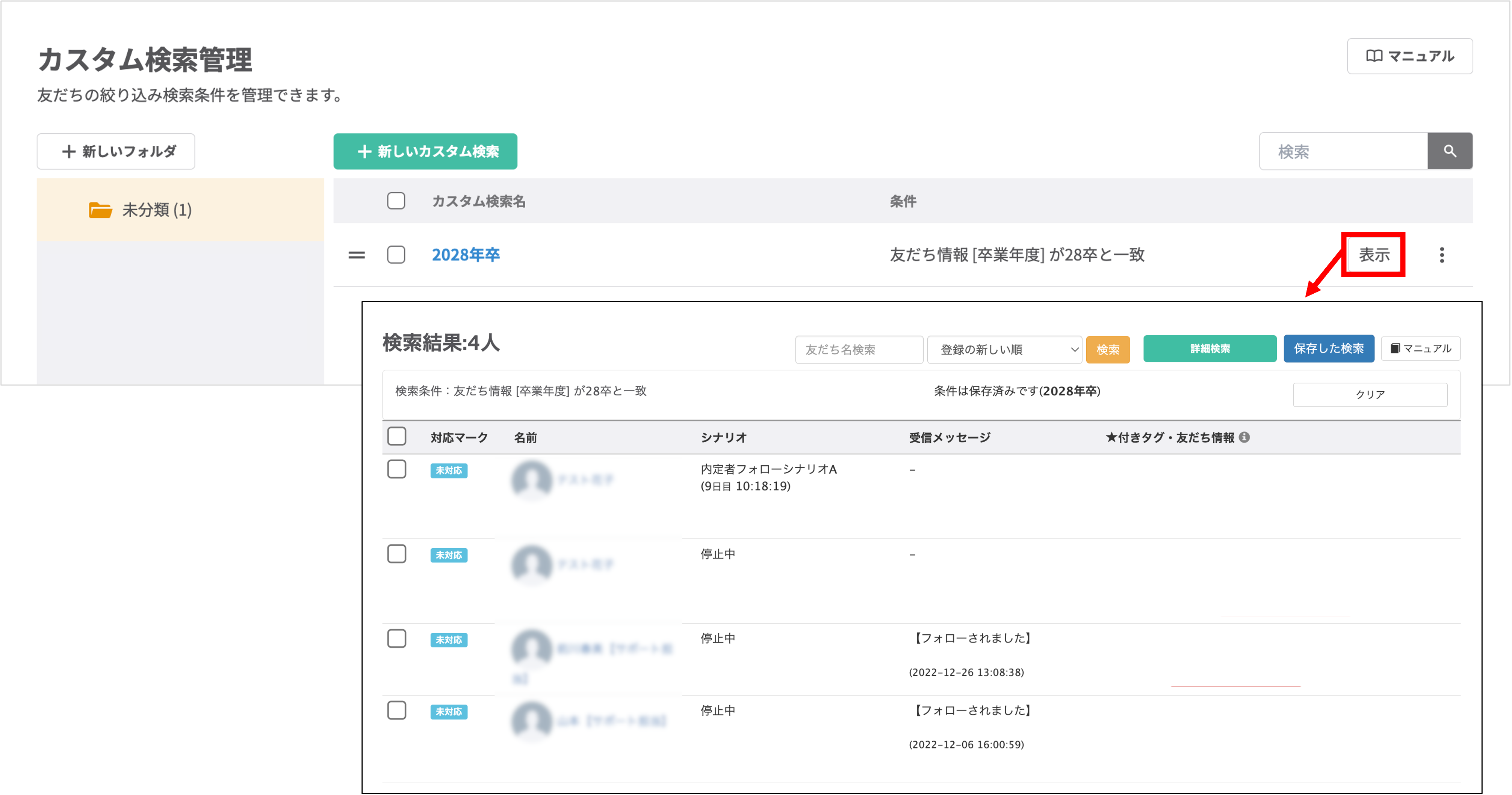 ★カスタム検索管理とは、友だちの絞り込み検索条件を保存・分類管理を行うことができる機能です。よく使う友だちの絞り込み条件を保存しておくことで毎回の検索の手間を省くことができます。