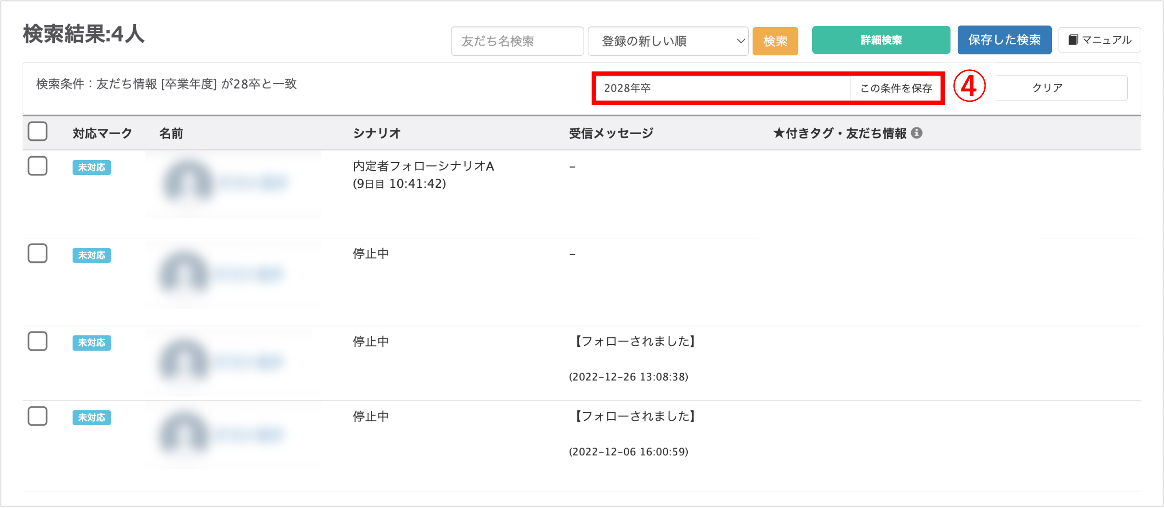 ④条件に該当する友だちが一覧で表示される画面へ切り替わりますので、画面右上の【カスタム検索名】ボックスに保存する管理用の名称を入力し〔この条件を保存〕ボタンをクリックします。