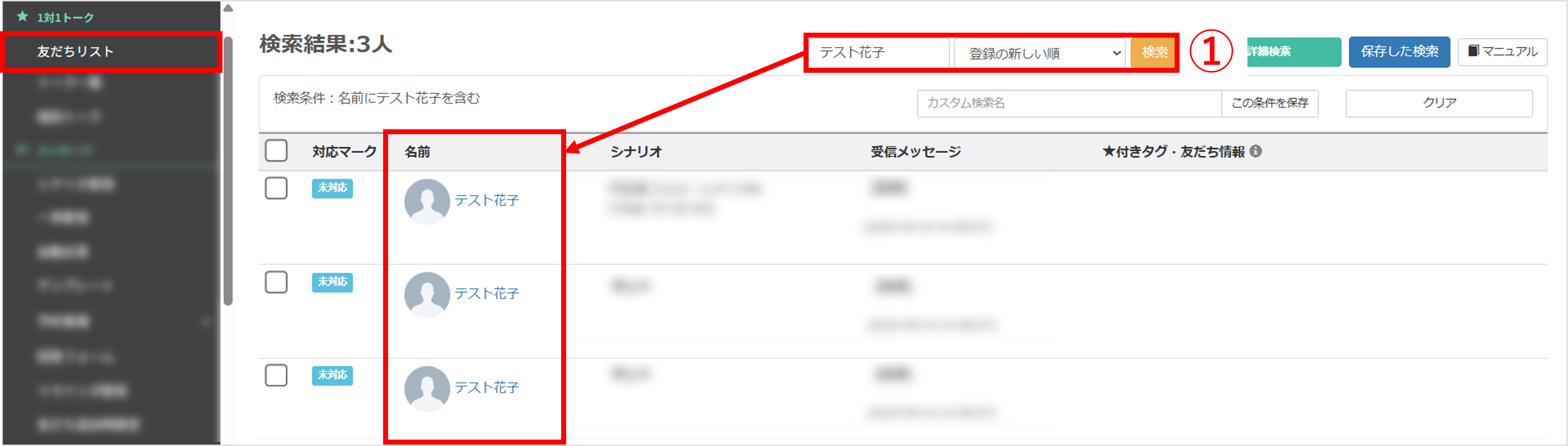 ①友だち名検索窓に友だちの名前を入力します。半角スペースと入れると複数人同時に検索できます。〔検索〕ボタンをクリックすると該当者が表示されます。