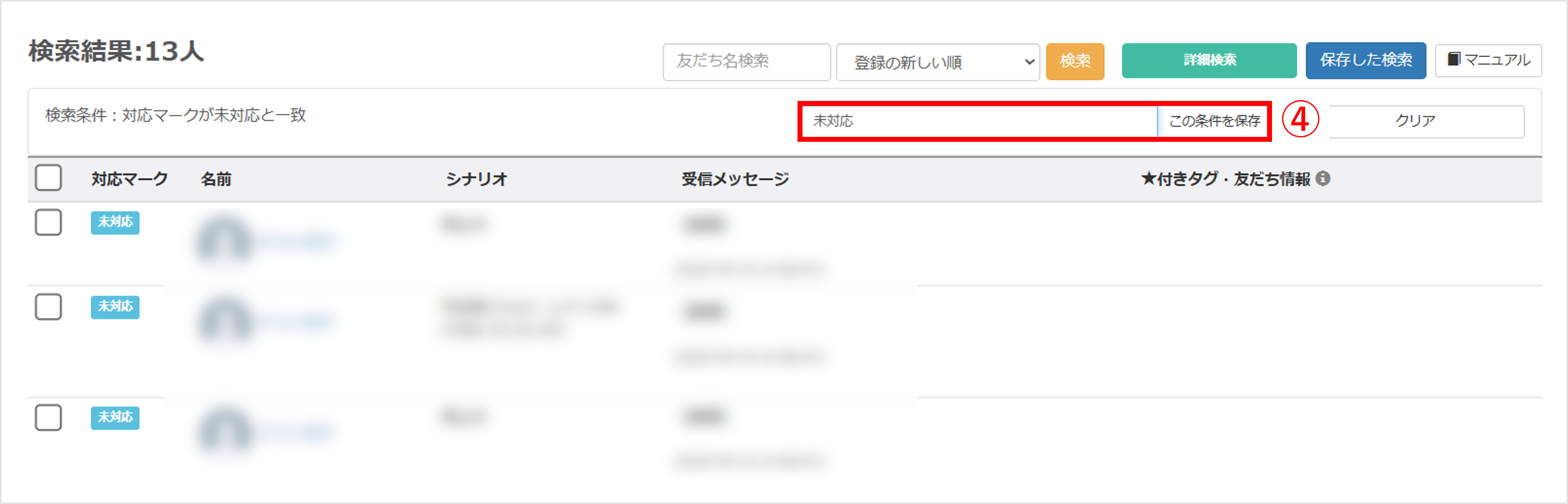★「毎回同じタグを検索するのが面倒…」「前にどの友達情報で検索したか覚えていない」といった場合に、カスタム検索を使用すると便利です。よく利用するセグメント分けをカスタム検索として保存できます。
