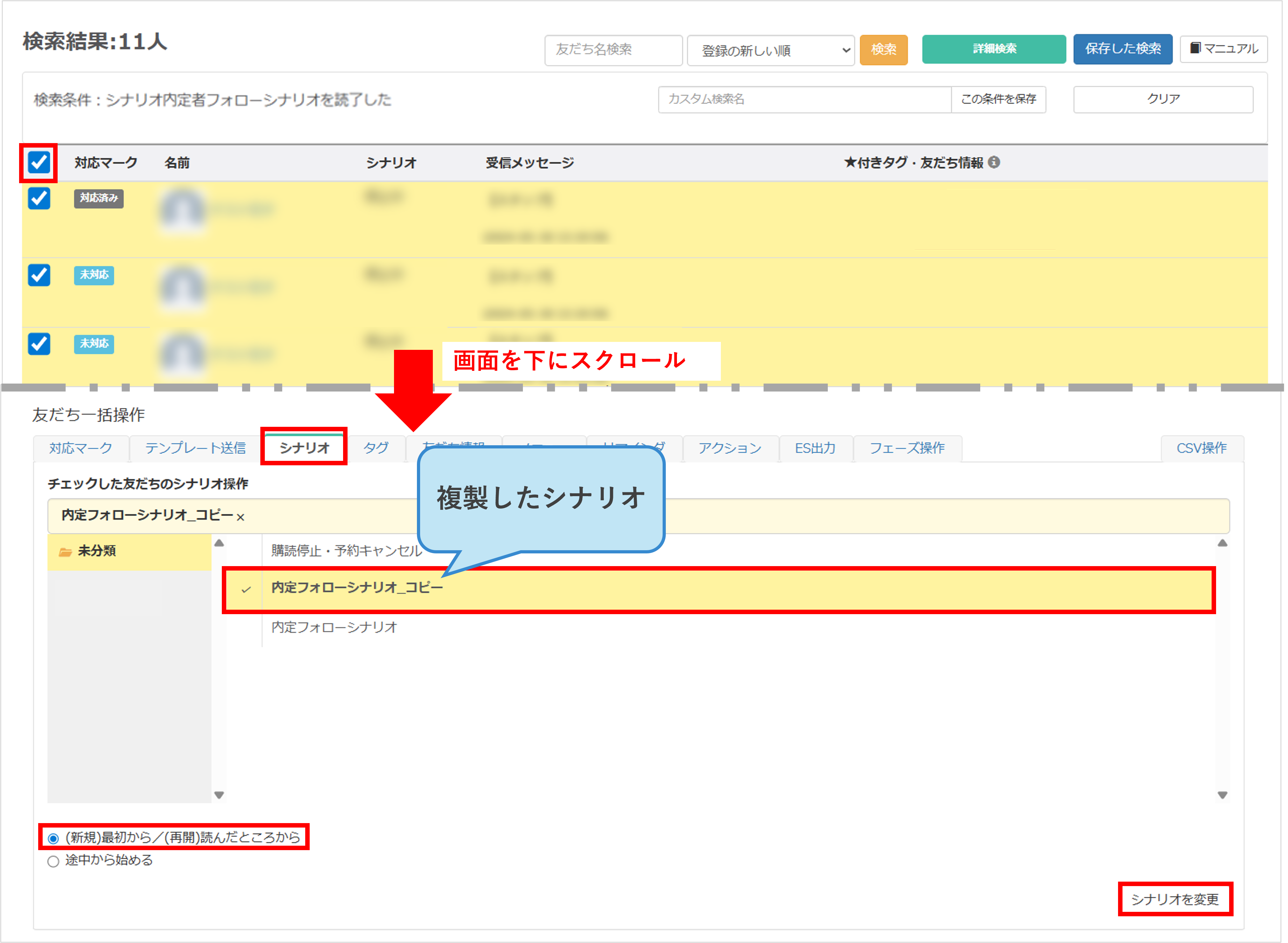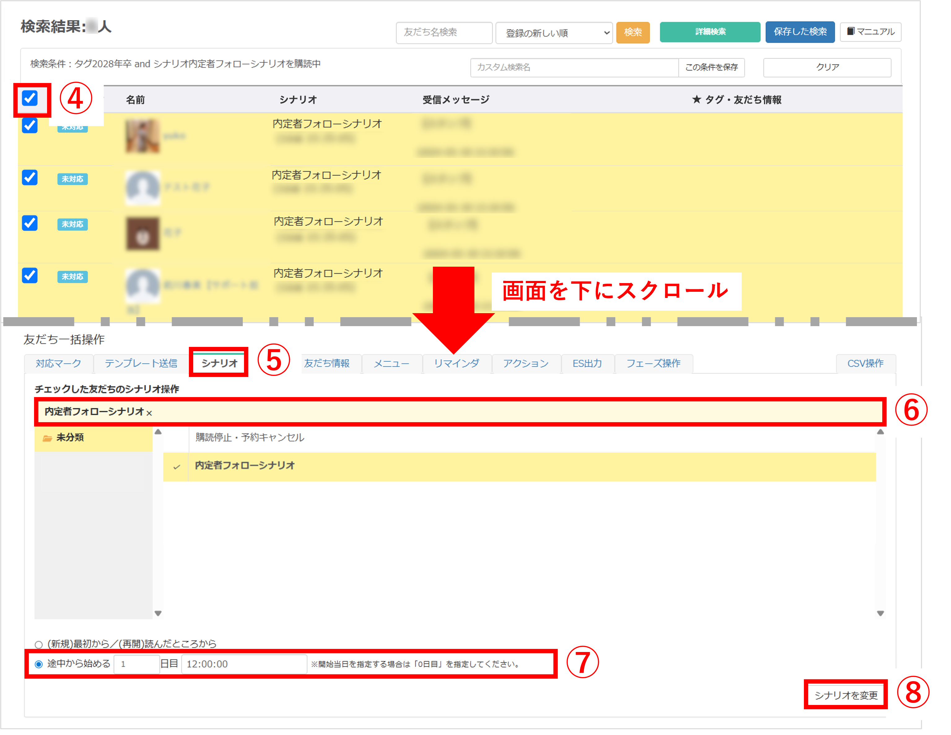 ⑤一括操作する友だちを選択したあと、画面を下にスクロールして『友だち一括操作』の『シナリオ』タブに切り替えます。