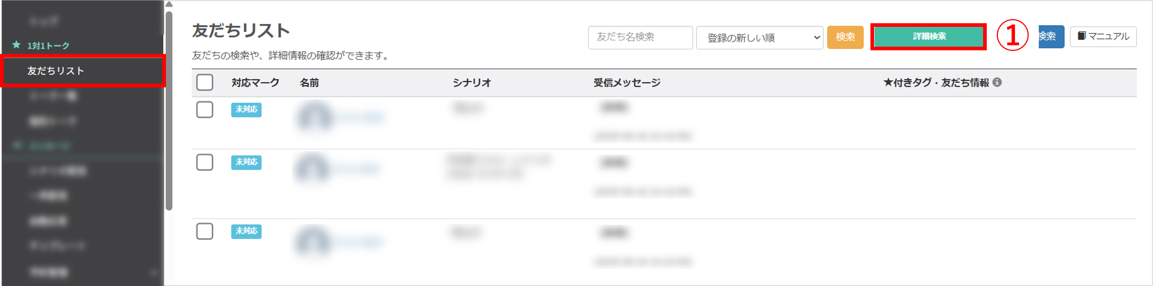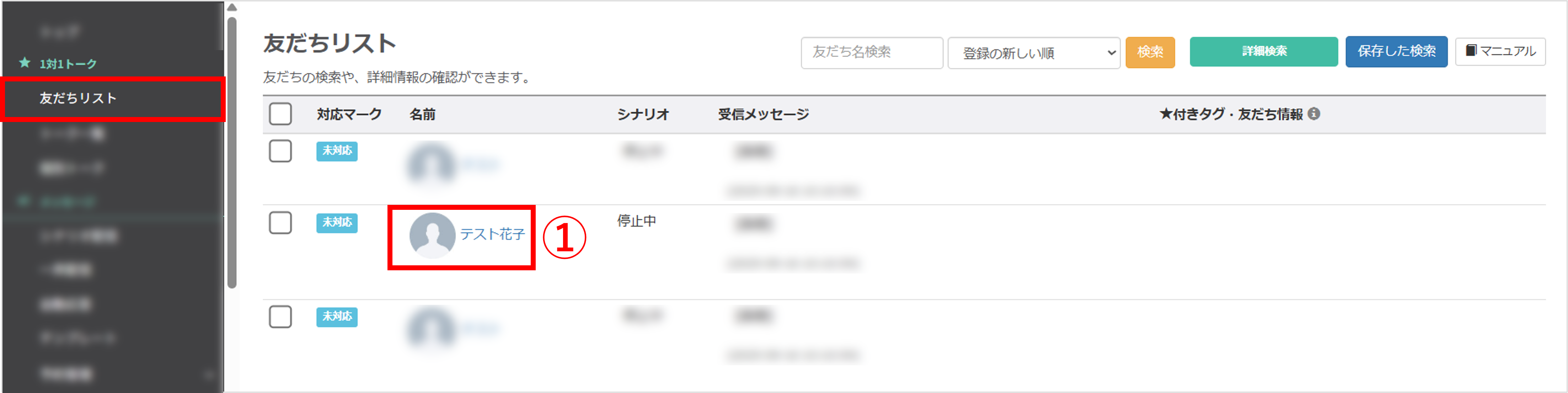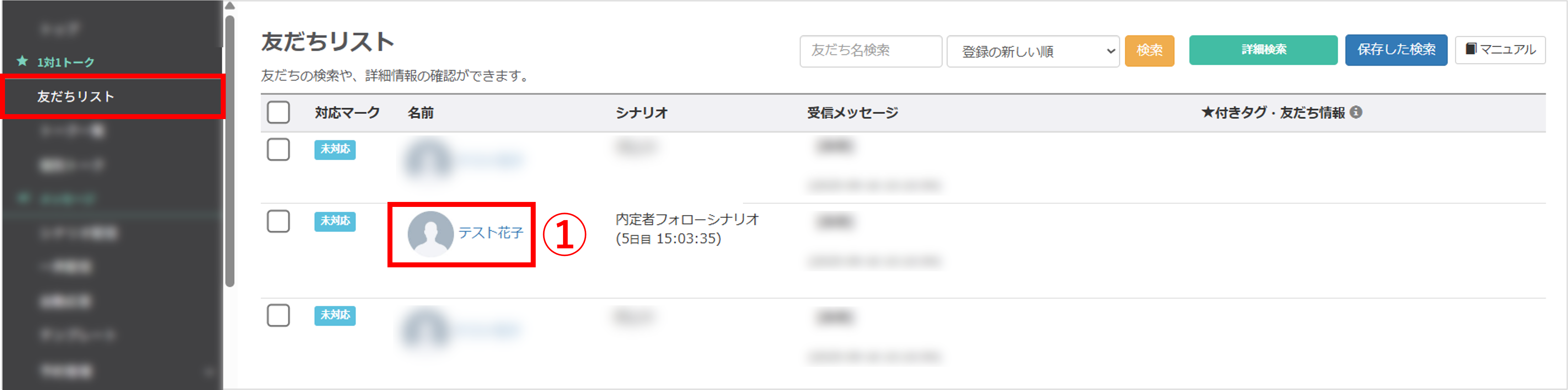 ①シナリオ配信の経過時間を操作させたい友だちの名前をクリックします。