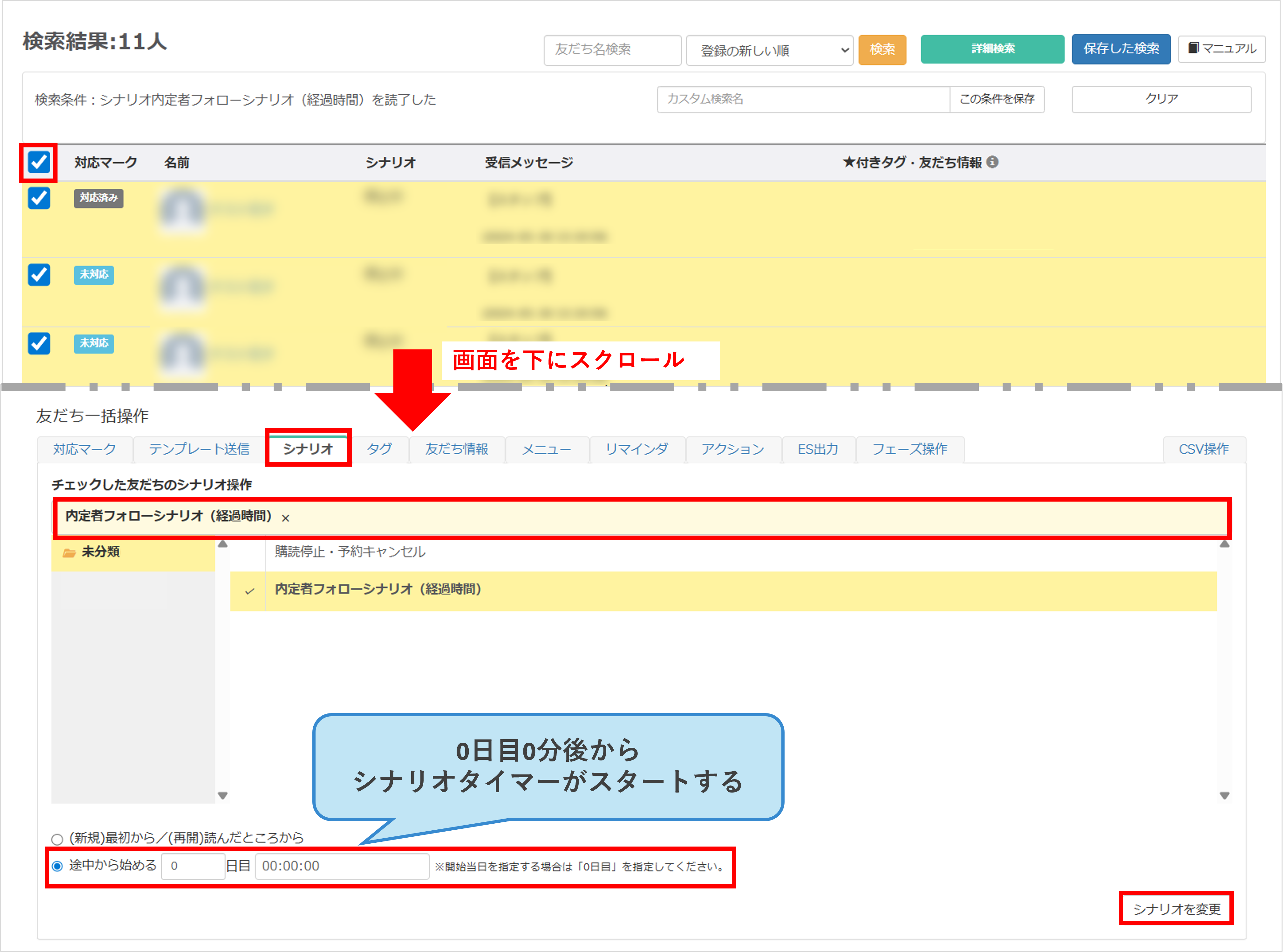 ★複数の友だちに対して、シナリオ配信の経過日時を一括で操作する手順で解説します。