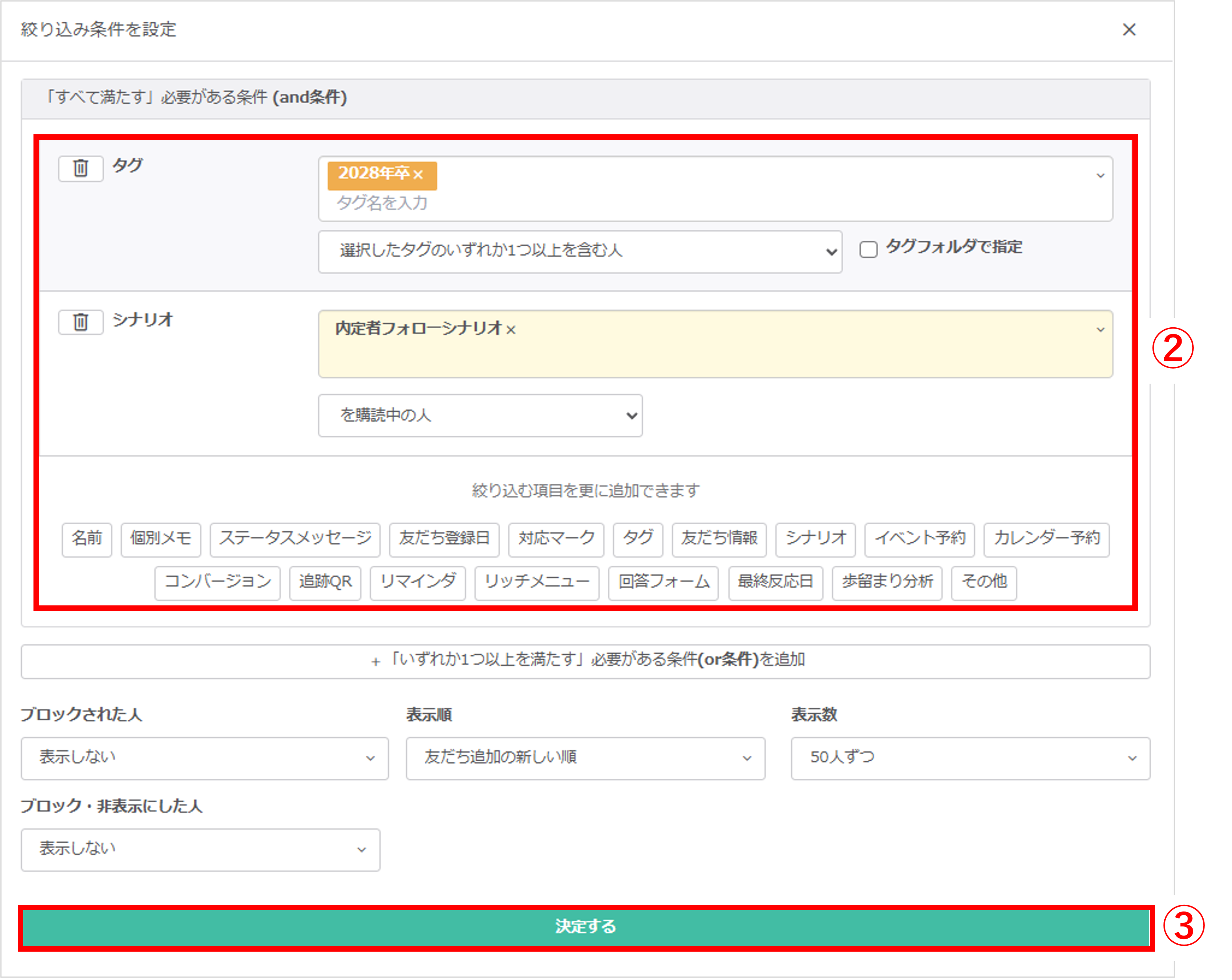 ②シナリオの配信経過時間を操作させたい友だちを絞り込みます。