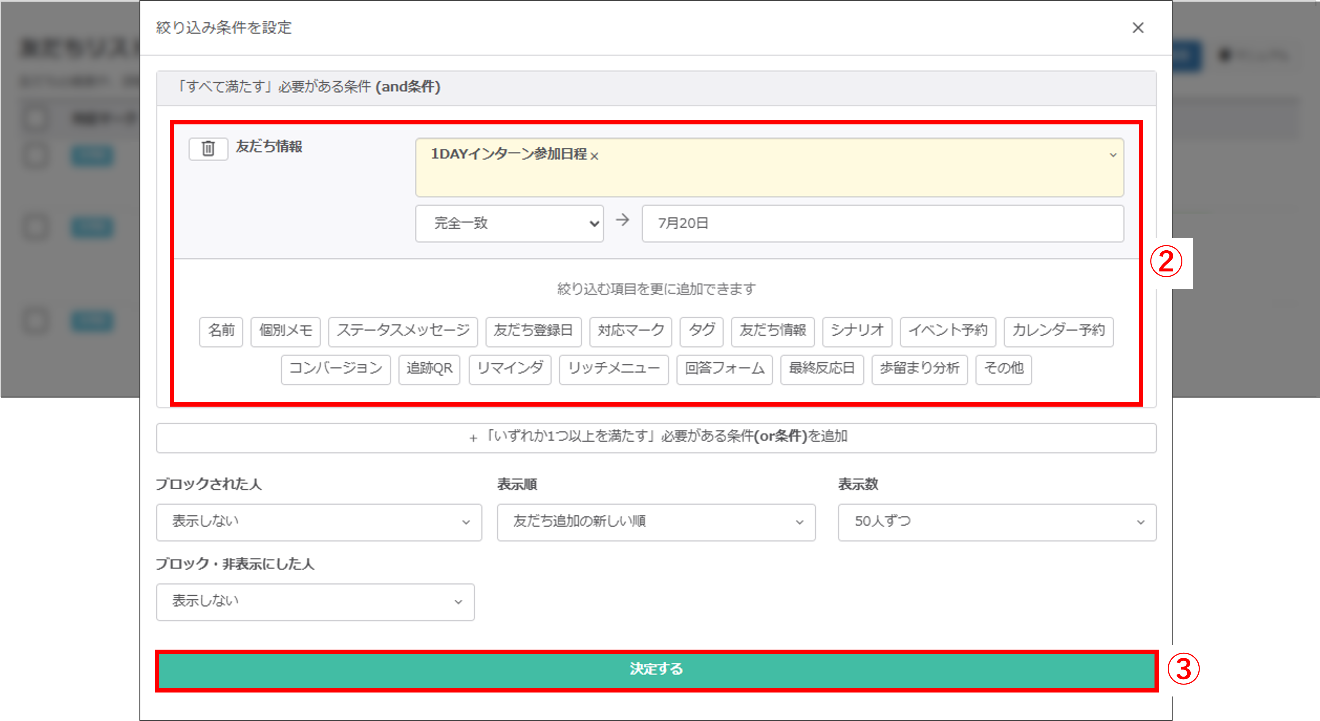 ★イベントに参加した友だちを絞り込むには、あらかじめ「タグ」や「友だち情報」でセグメント分けをしておく必要があります。