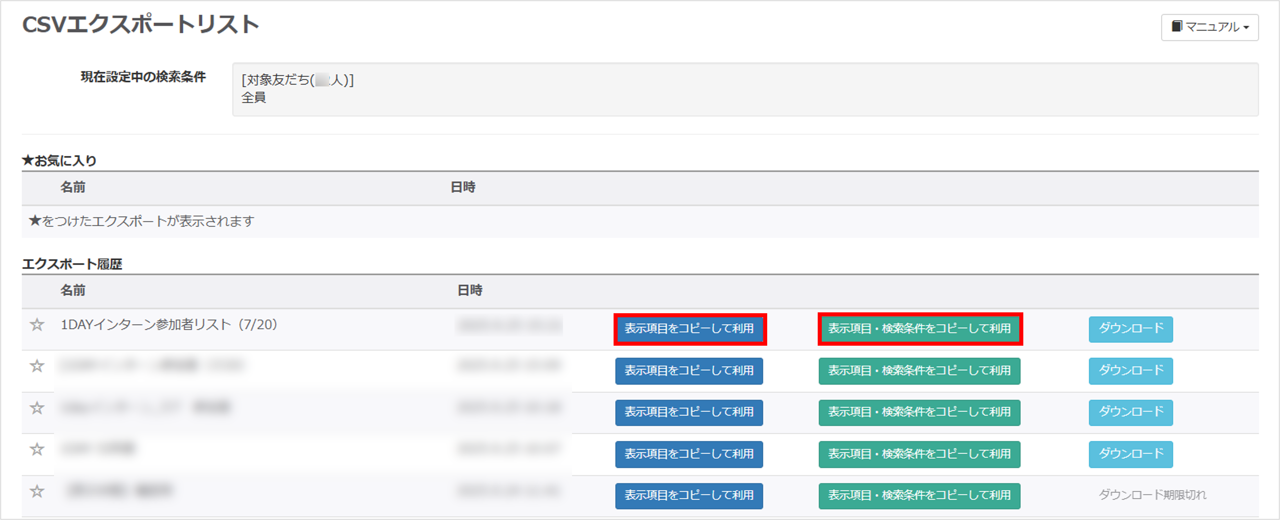 ・表示項目・検索条件をコピーして利用:CSVエクスポート画面で設定していた「表示項目」と友だちリスト画面で設定していた「検索条件」をコピーして利用できます。