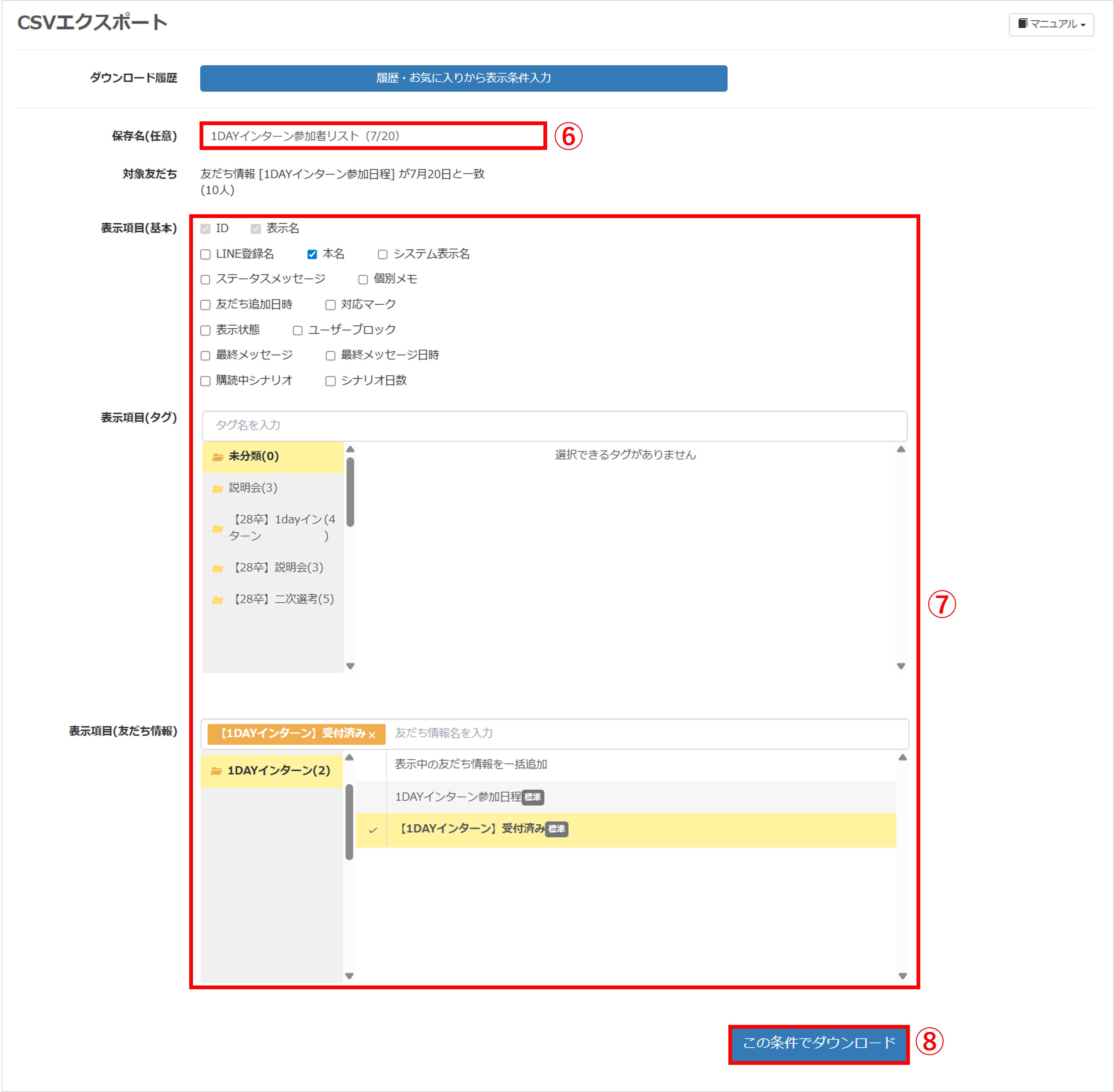 ⑦『表示項目(基本)』『表示項目(タグ)』『表示項目(友だち情報)』から必要な項目を選択します。