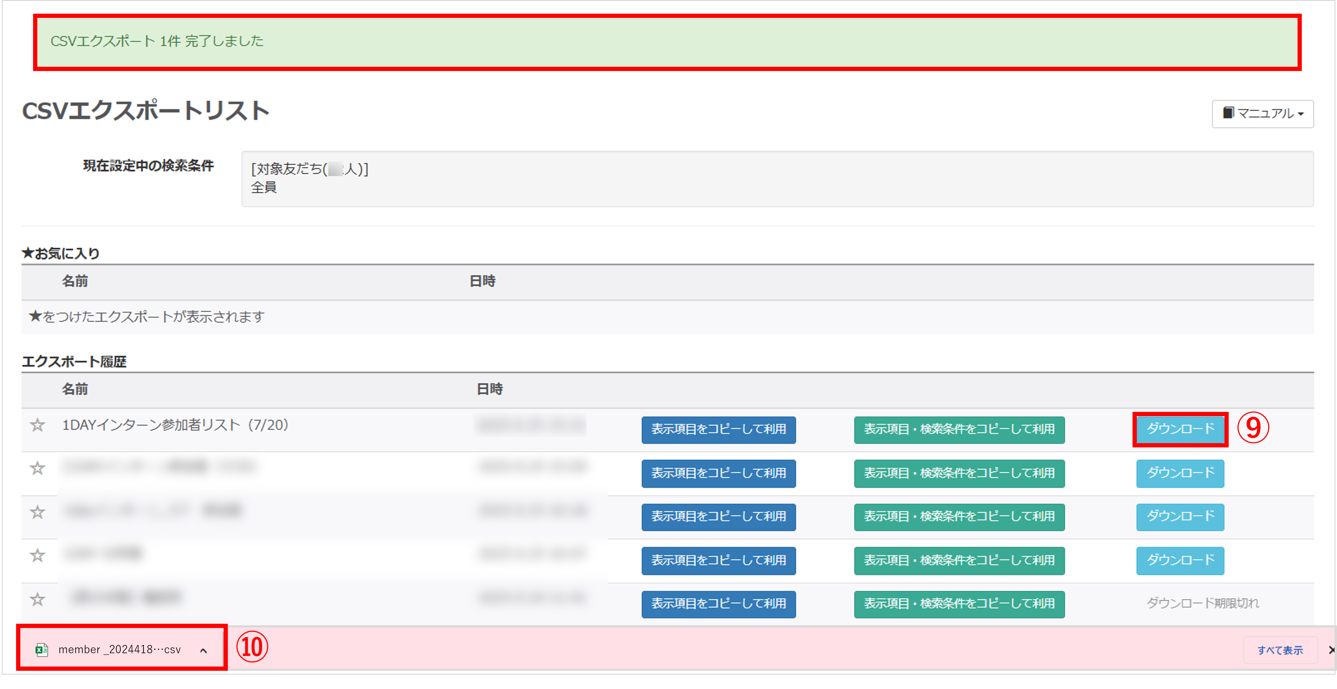 ⑨処理が終了するとエクスポート履歴に〔ダウンロード〕ボタンが表示され、クリックするとCSVファイルがダウンロードされます。