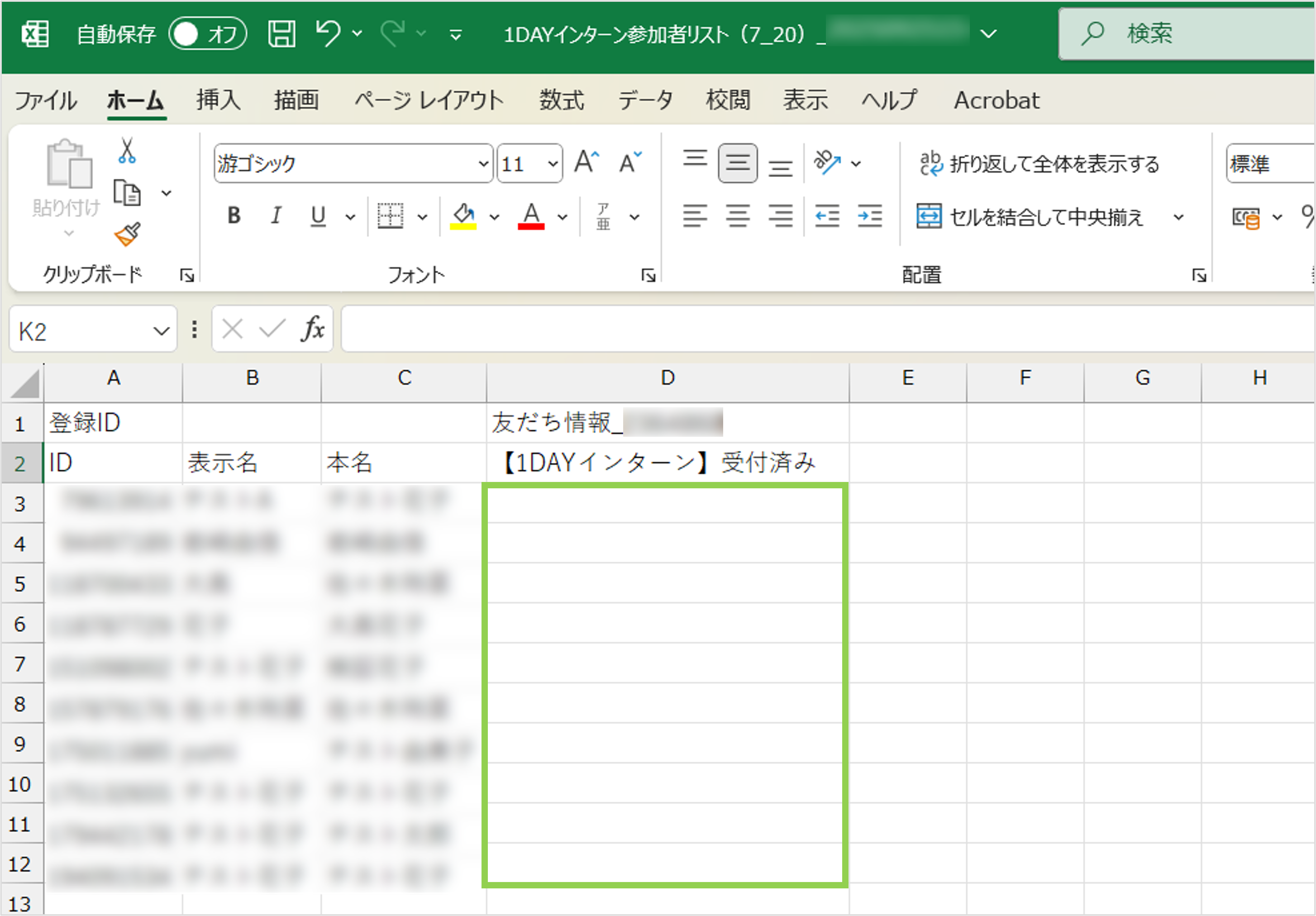 受付表 リスト エクスポート インターンシップ