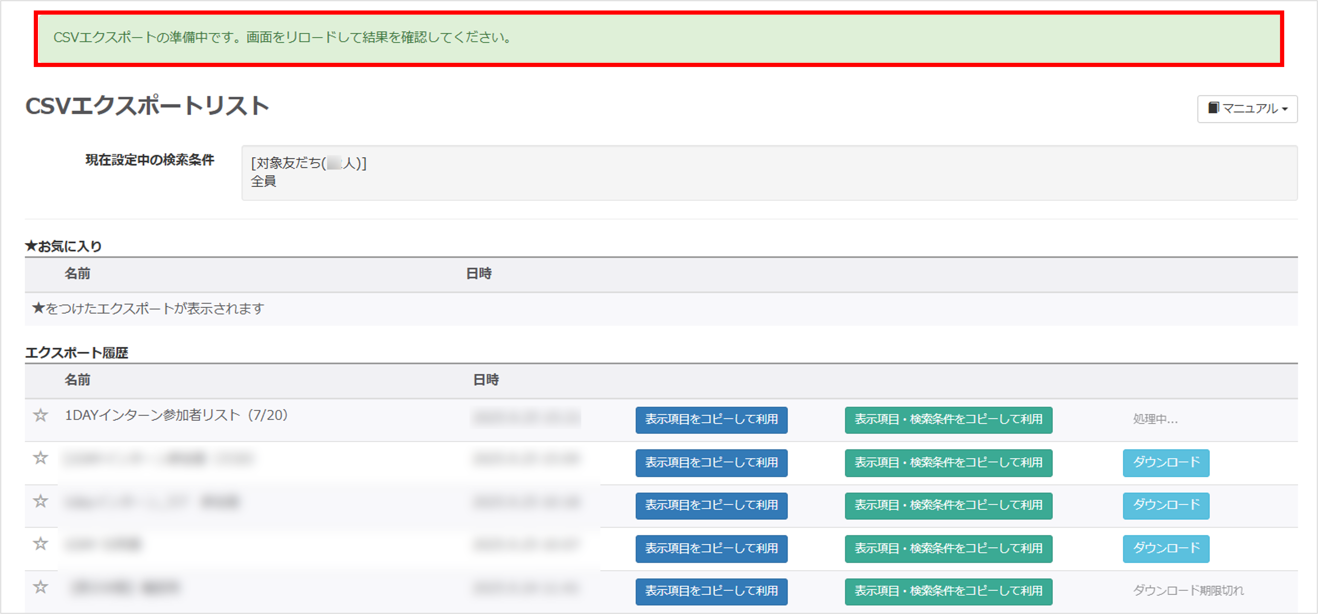 CSVエクスポートリスト画面に遷移します。画面をリロードすると画面が切り替わります。