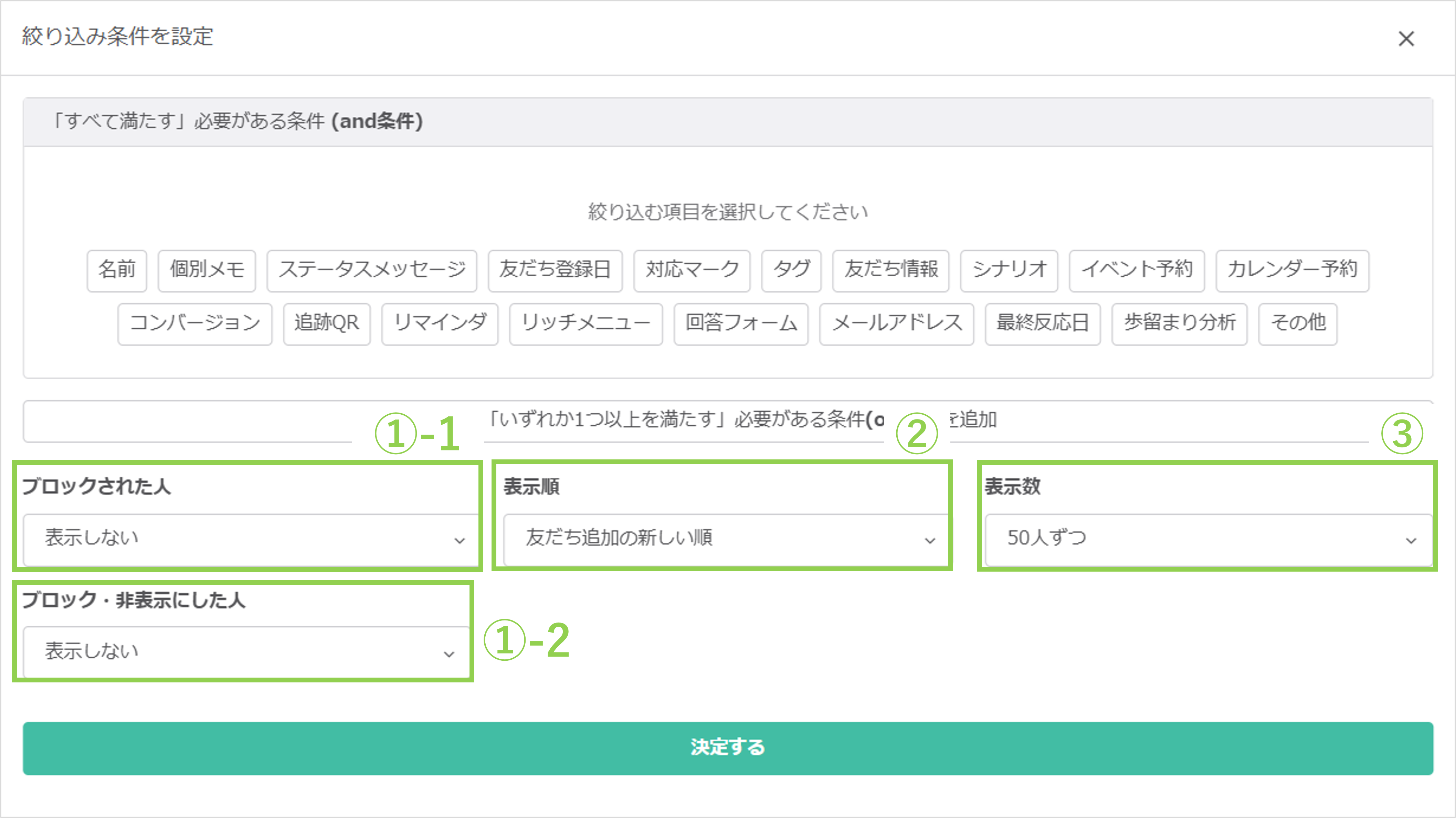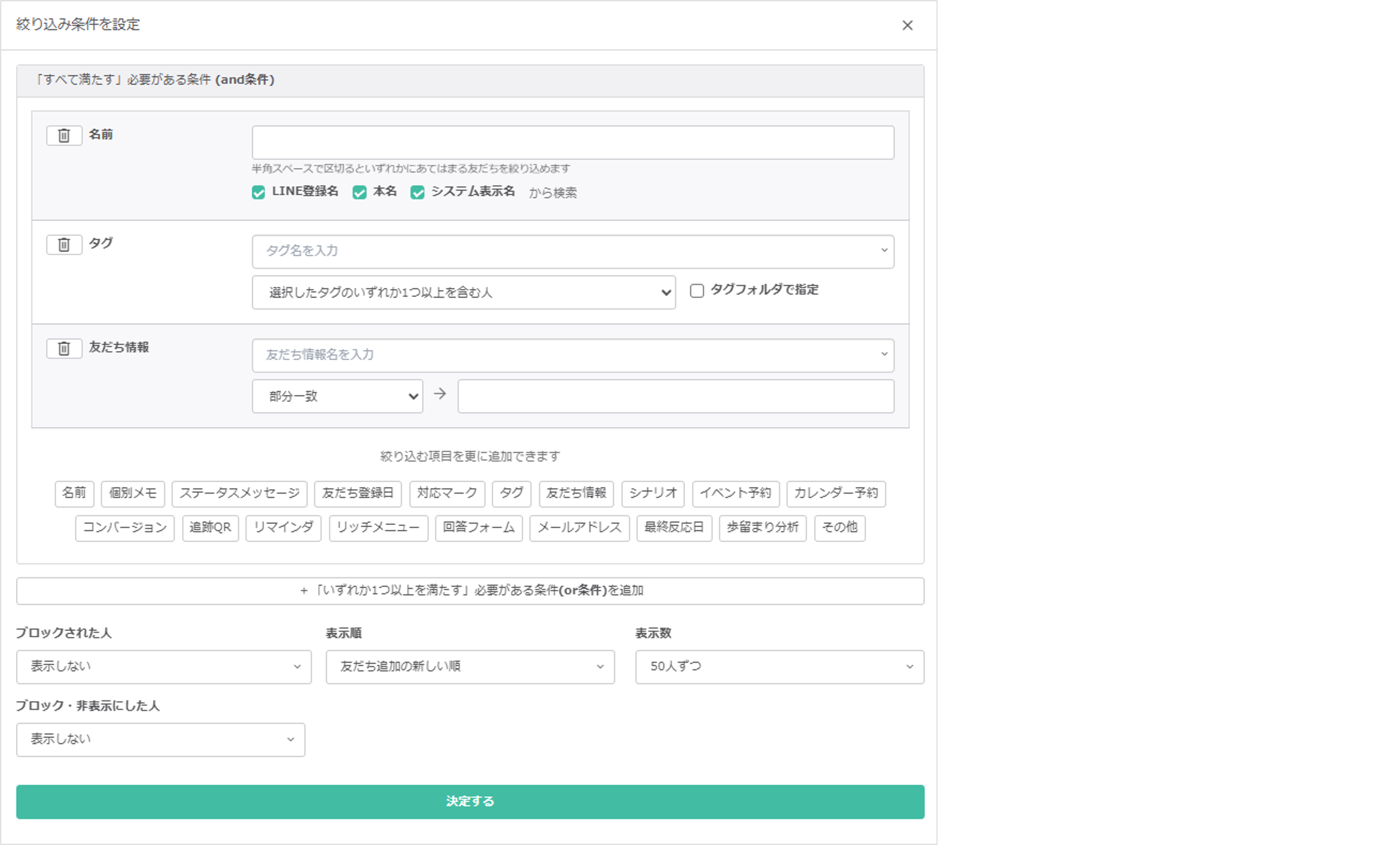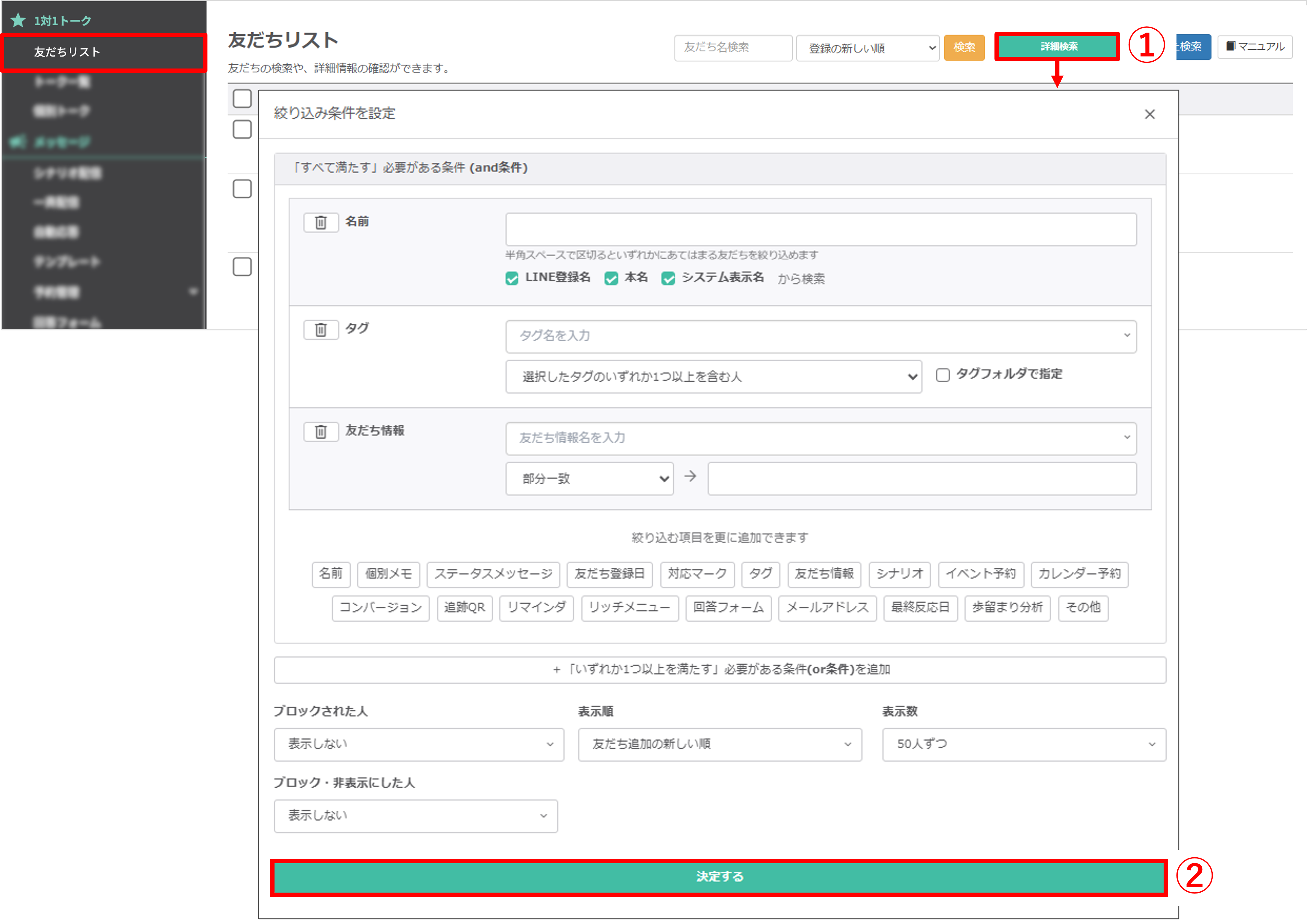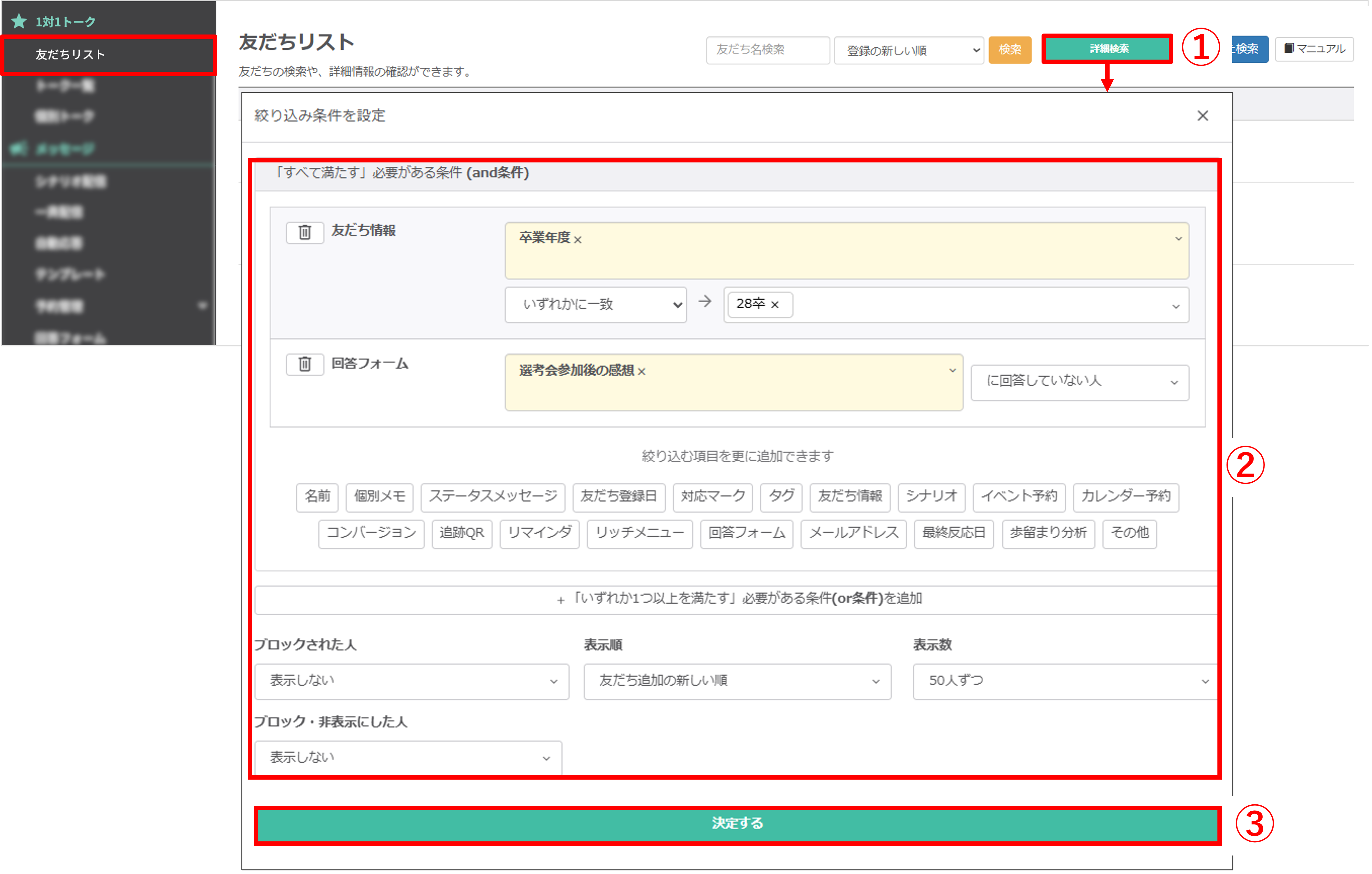 友だちリスト 詳細検索 絞り込み セグメント検索 分類検索 セグメント分け 区分 選考評価 選考管理 面接管理 採用管理 評価 ジャッジ