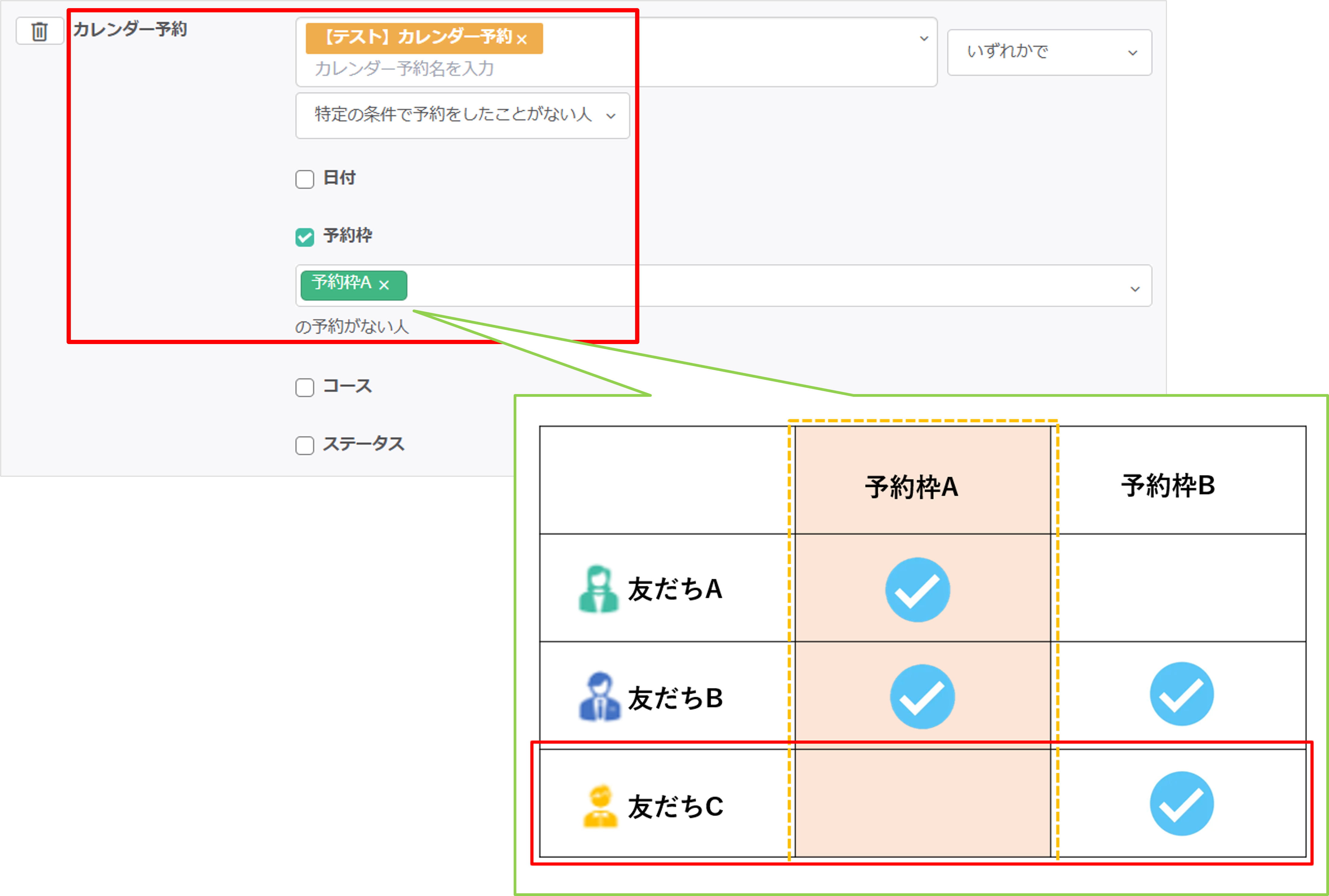 ★予約枠Aに予約をしたことがない友だち(友だちC)のみを絞り込めます。