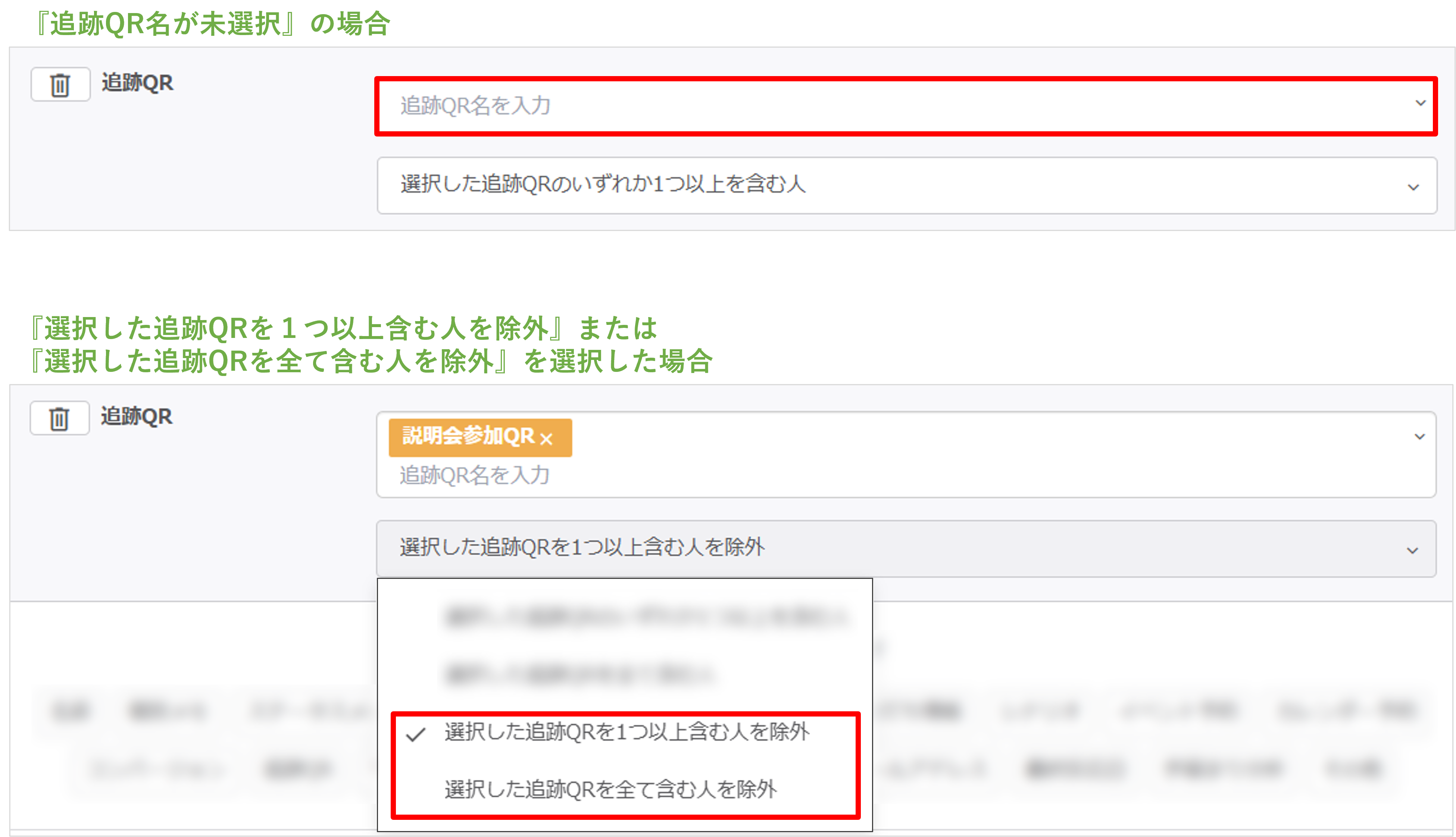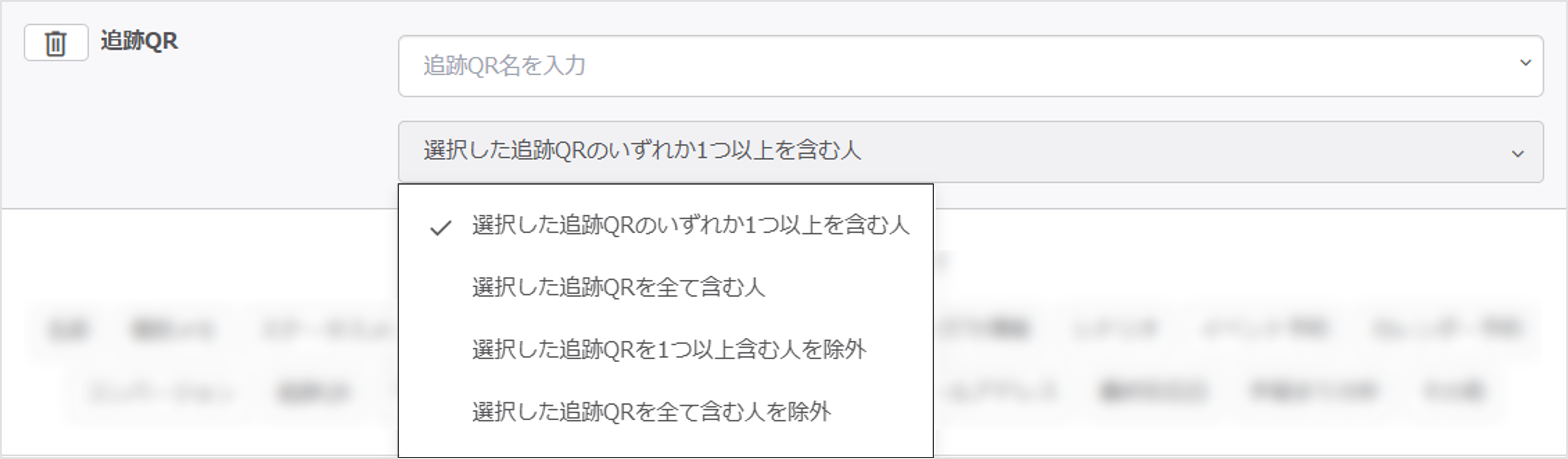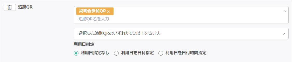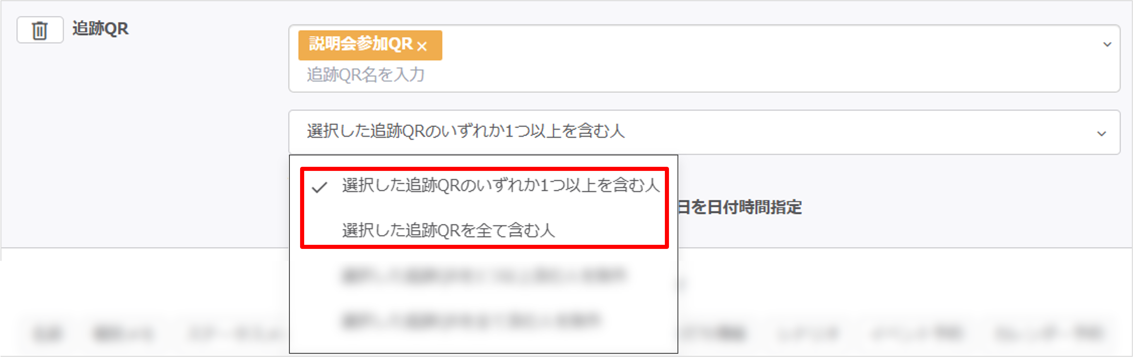 また、「選択した追跡QRのいずれか1つ以上を含む人」または「選択した追跡QRを全て含む人」を選択した場合、以下の条件を指定して検索できます。