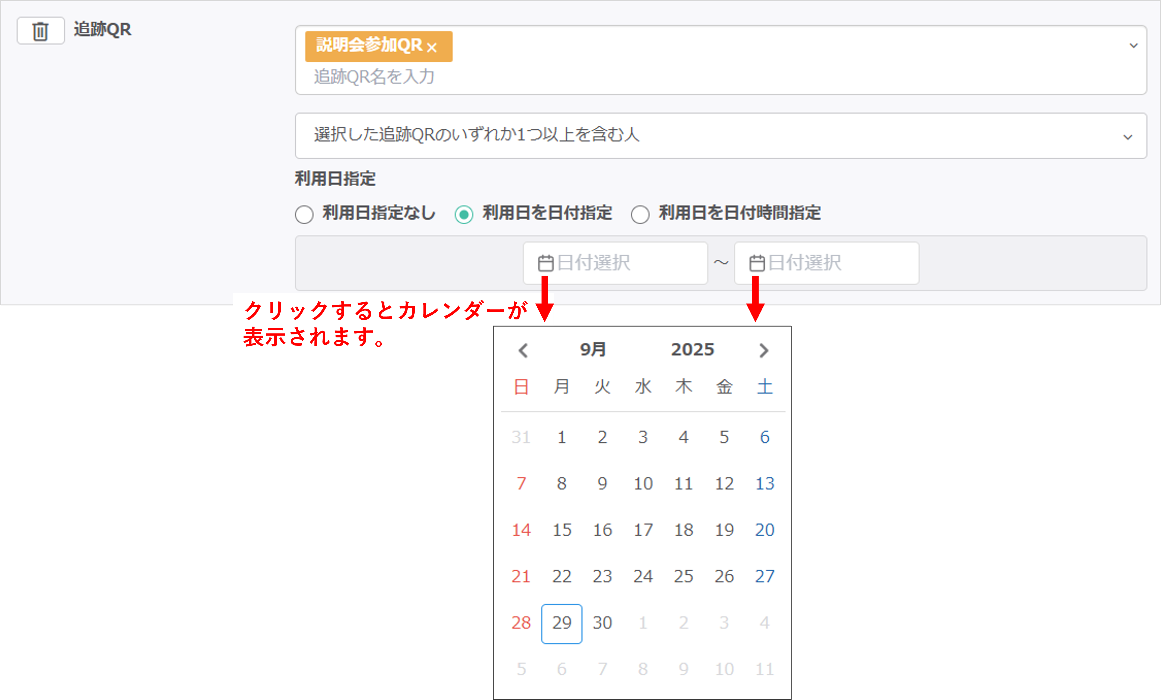 利用日を「日付」で指定し、期間内に指定した追跡QRを読み込んだ友だちを絞り込めます。