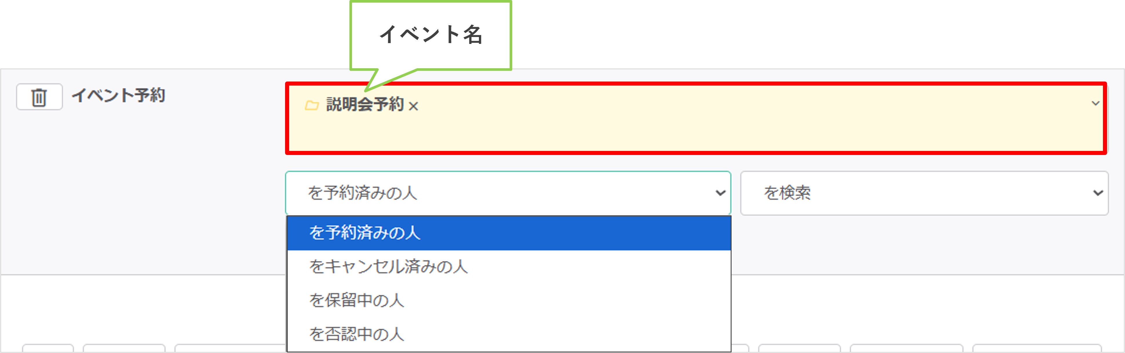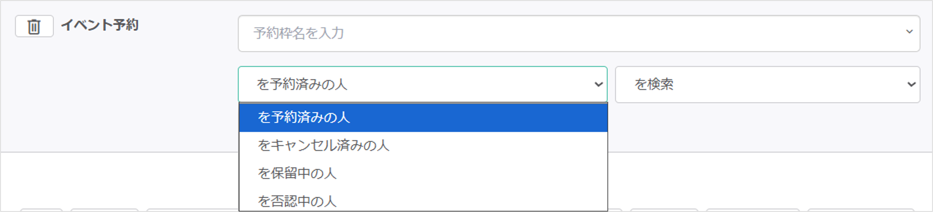 指定したイベント予約枠名の以下の予約状態、または以下の予約状態を除いた人を検索できます。