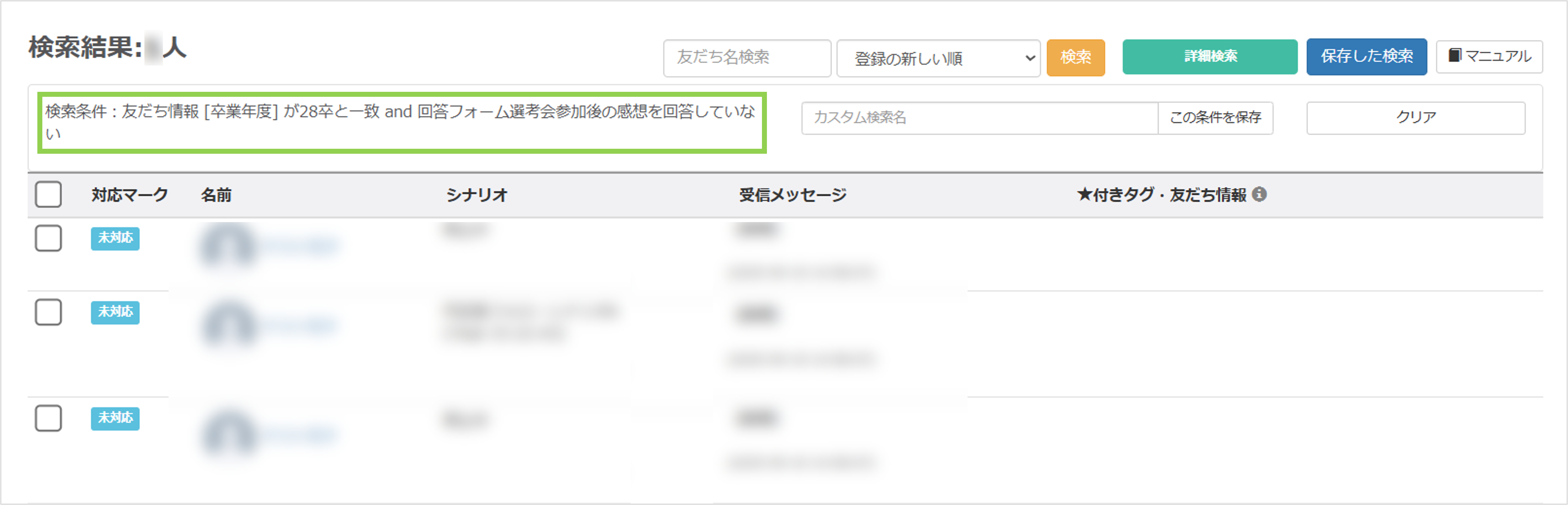 また、よく使用する検索条件を保存しておくことで、毎回詳細検索を行わずに友だちの分類・管理ができます。