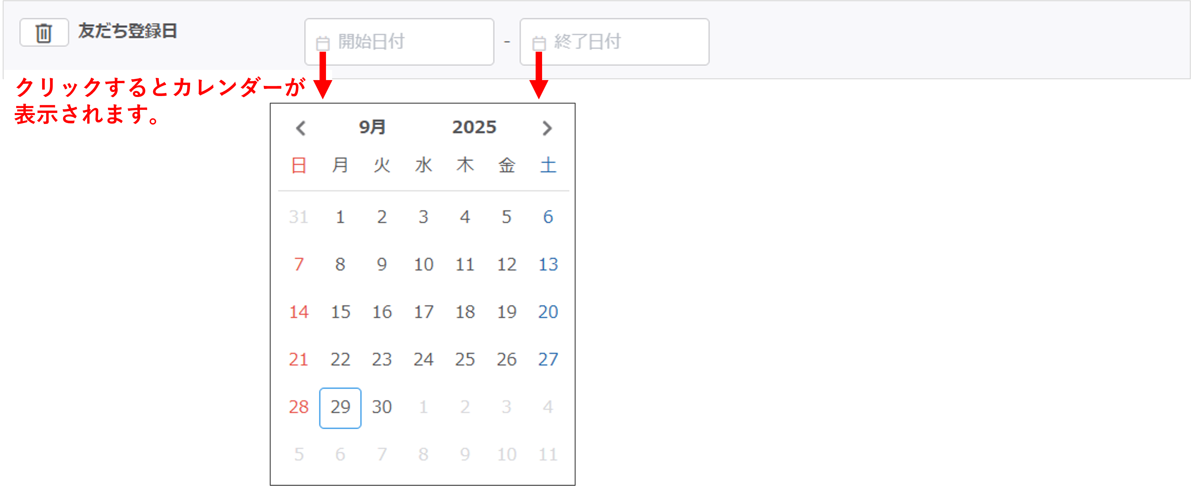 【年/月/日で絞り込み】:登録された年月日から指定した日付の範囲に該当する友だちを検索します。