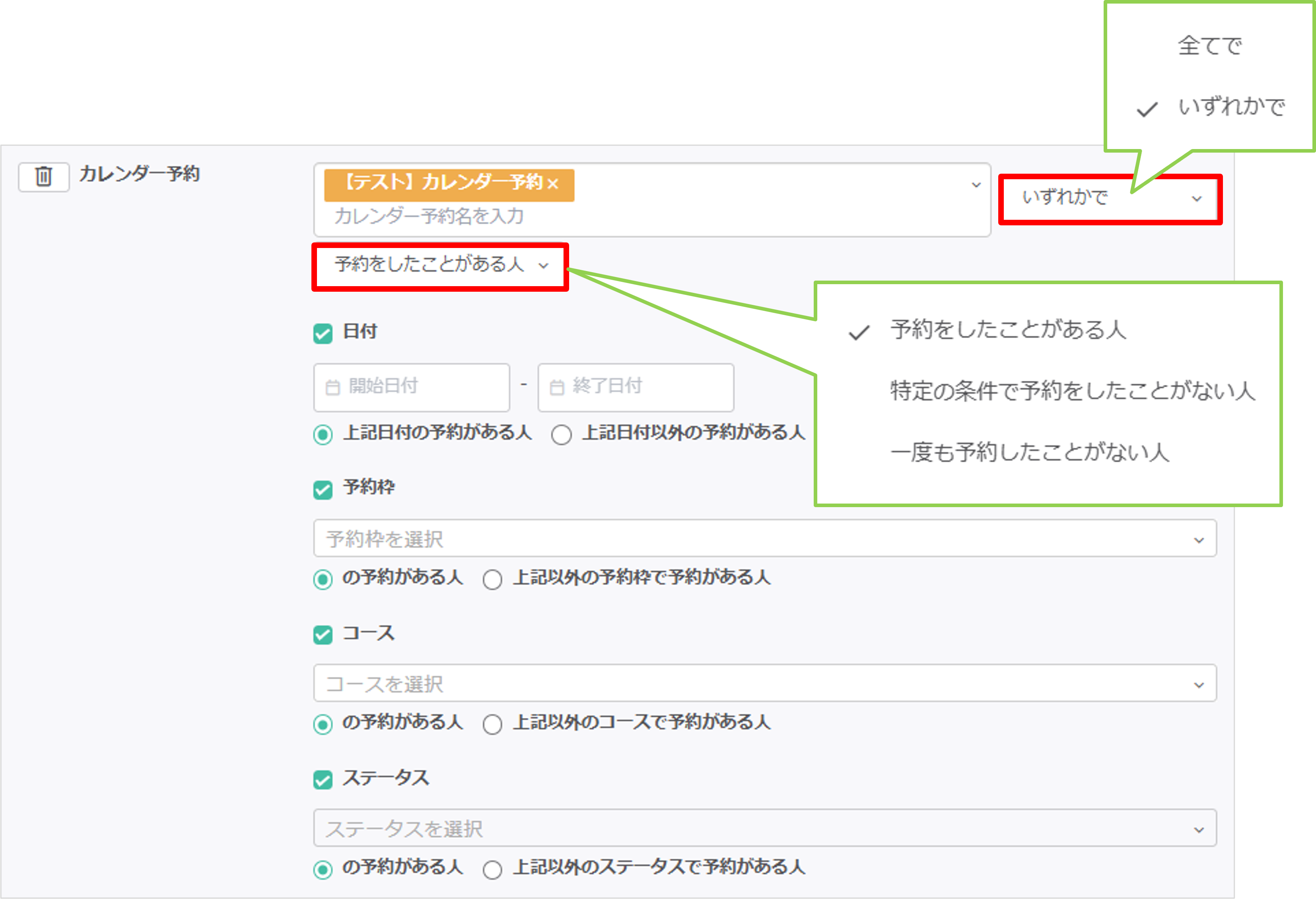 選択したカレンダーの「いずれかで」または「全てで」について、以下の条件と日時・予約枠・コース・ステータスを指定して検索できます。