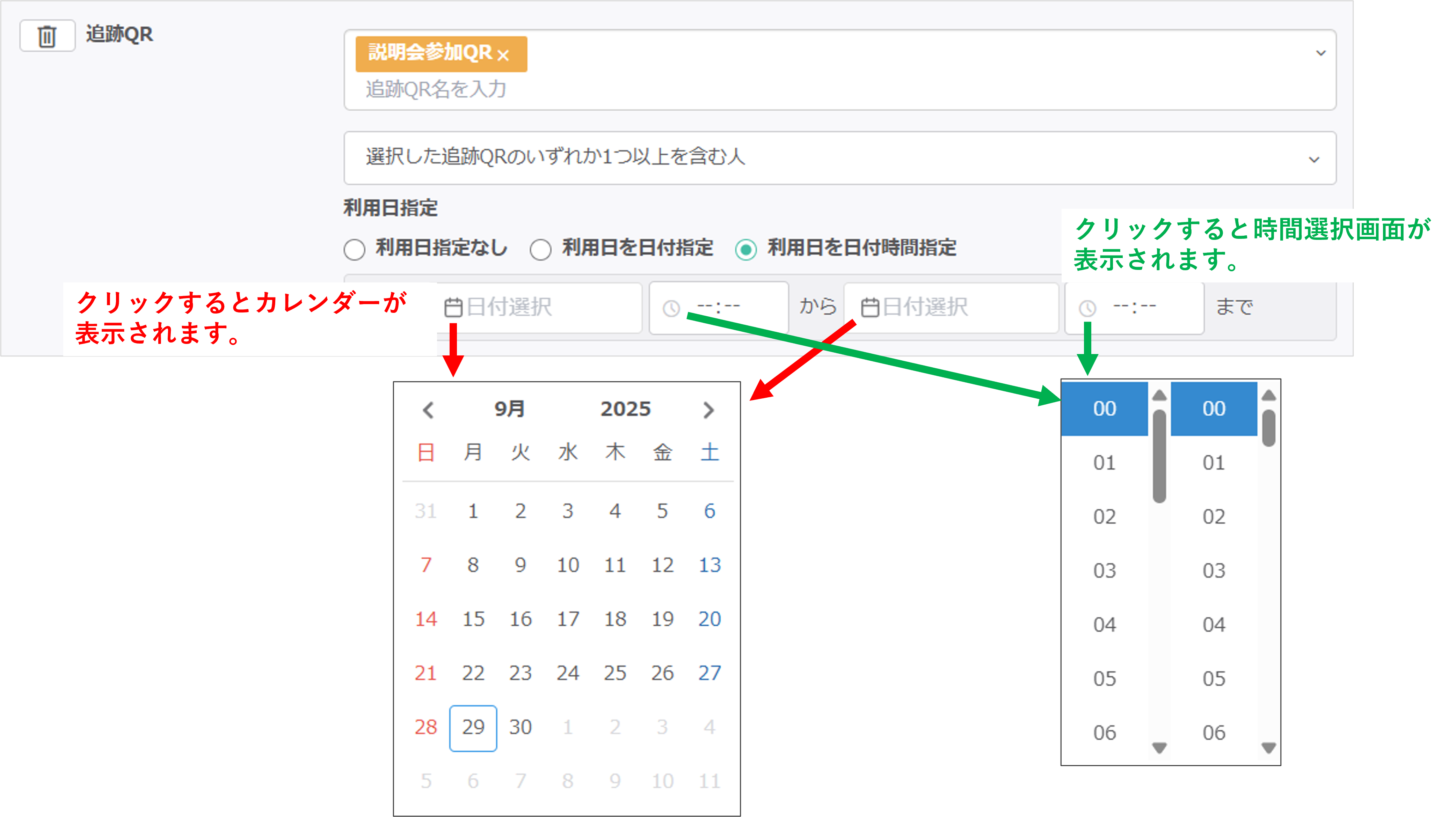 利用日を「日付と時間」で指定し、期間内に指定した追跡QRを読み込んだ友だちを絞り込めます。