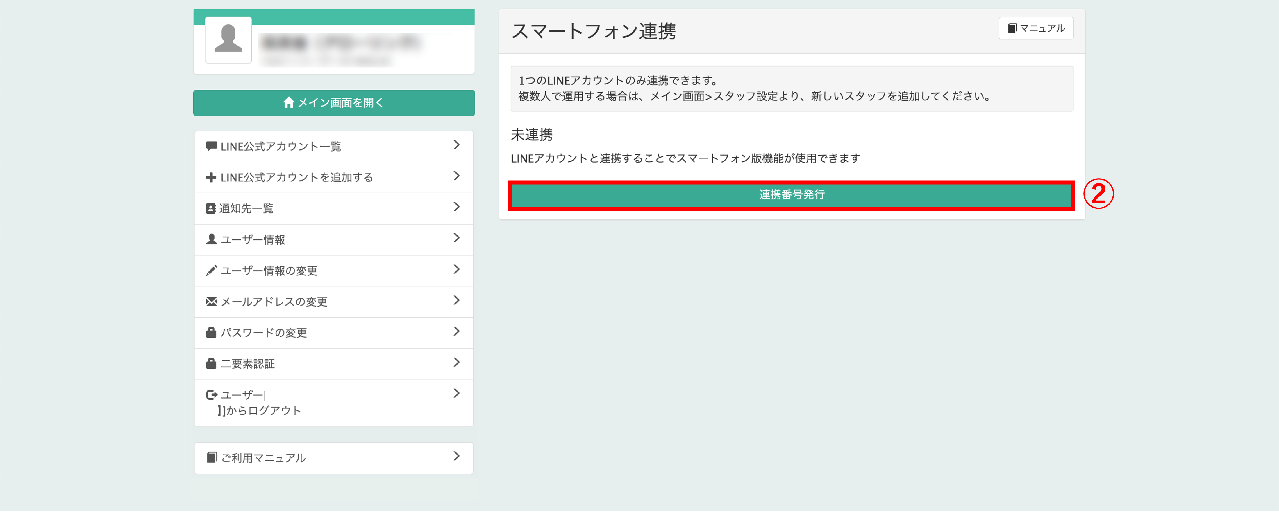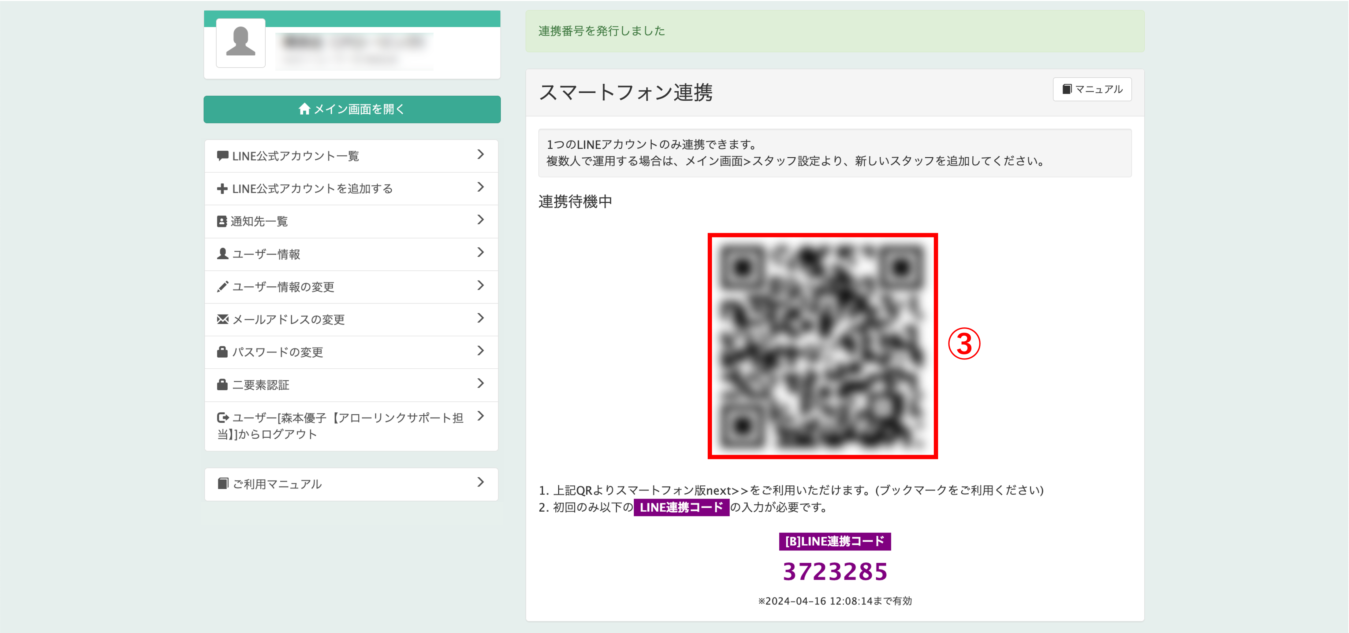 ②〔連携番号発行〕ボタンをクリックしてQRコードとLINE連携コードを確認します。
