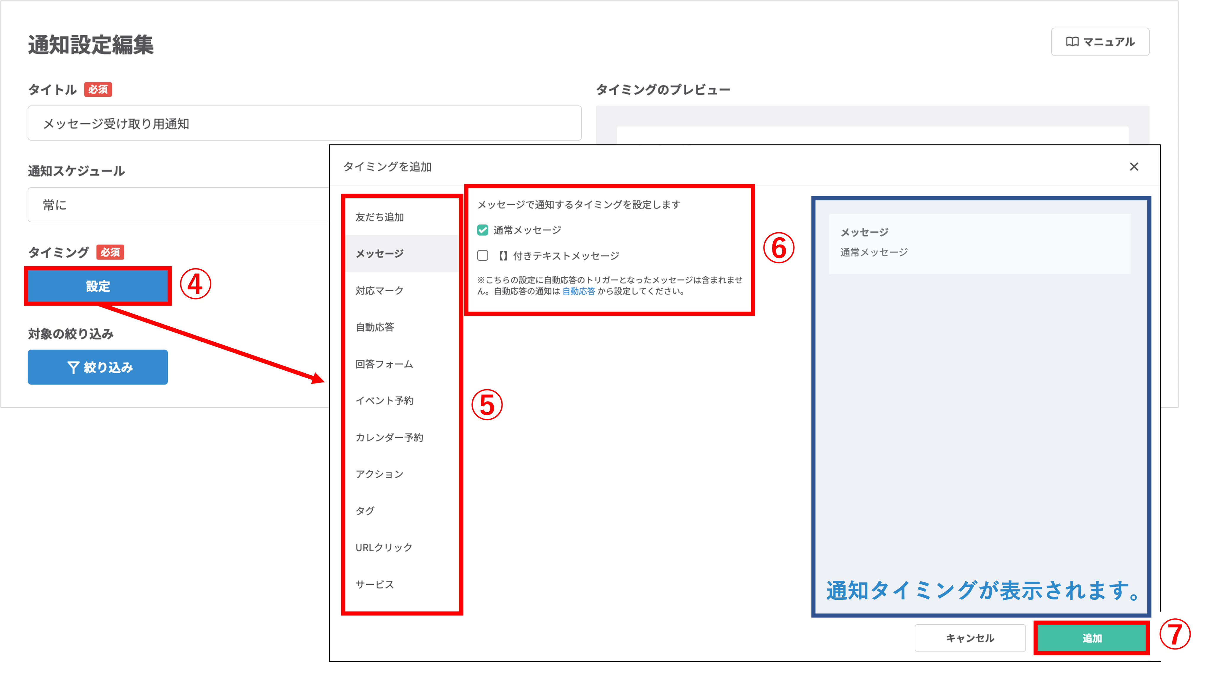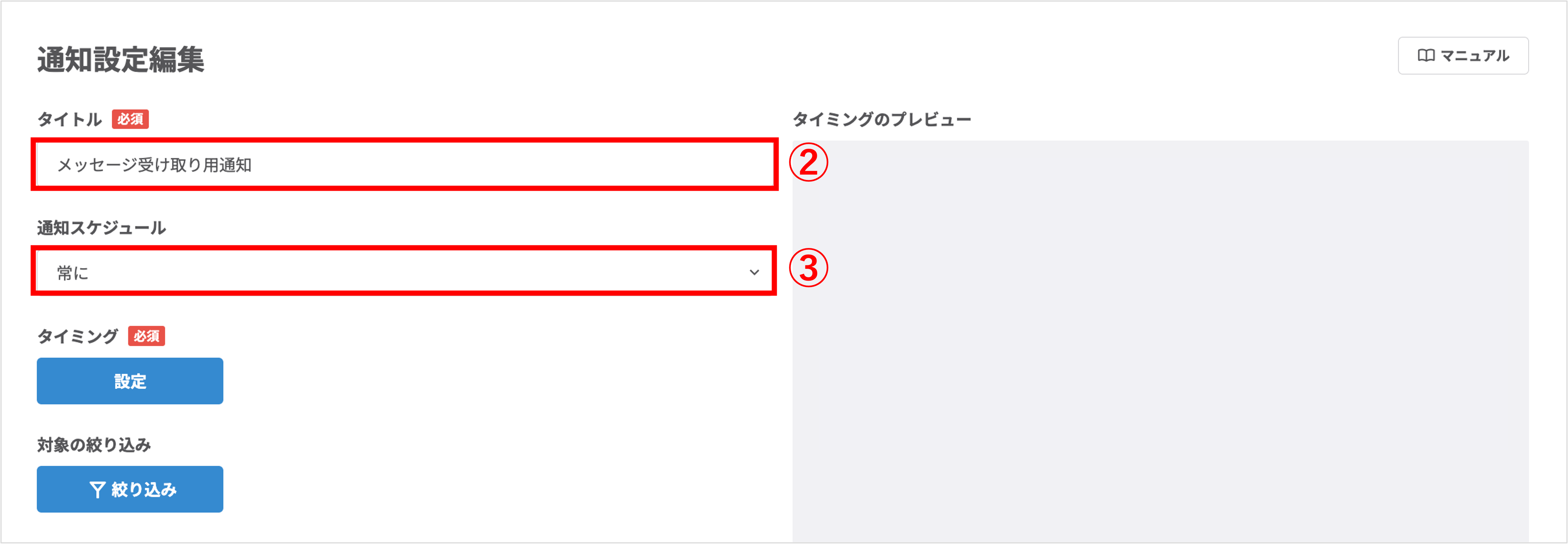 ⑧タグや友だち情報などで通知する対象を絞り込みたい場合は『対象の絞り込み』の〔絞り込み〕ボタンをクリックします。