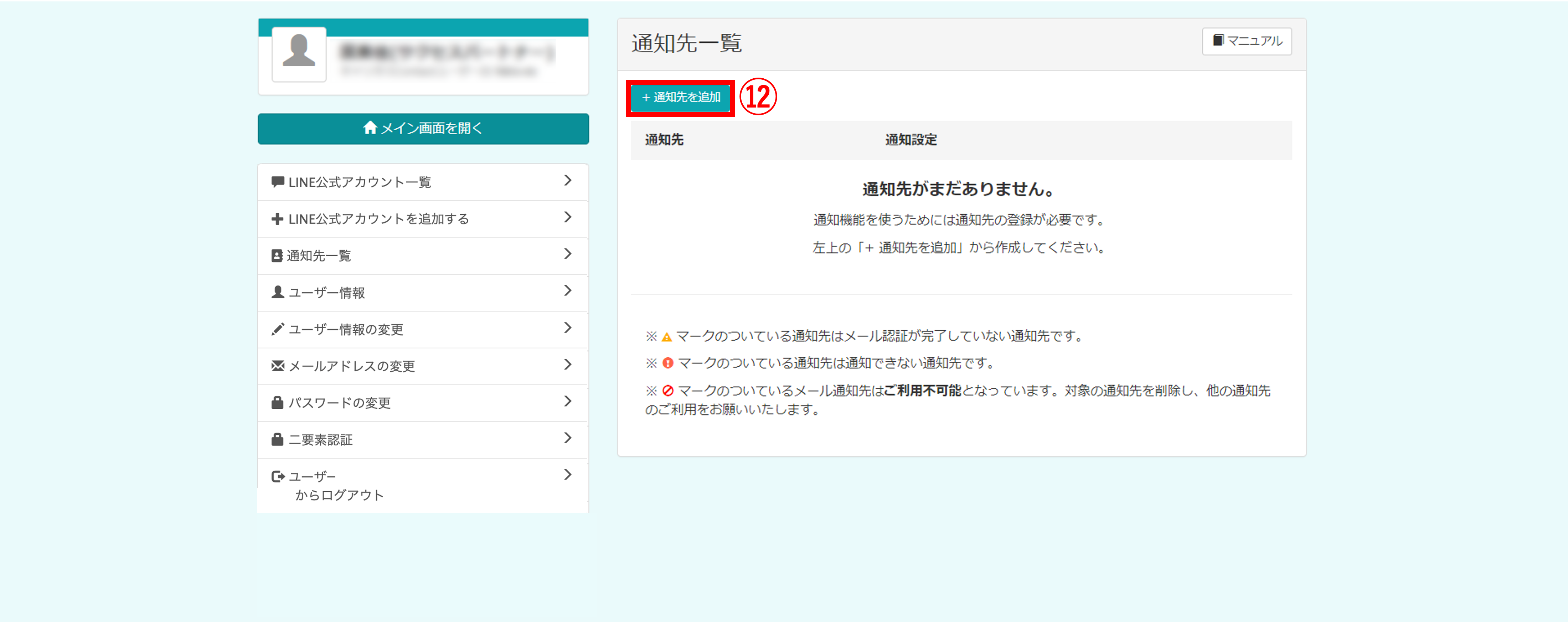 ⑫別タブで通知先一覧ページが開きますので、〔+通知先を追加〕ボタンをクリックします。