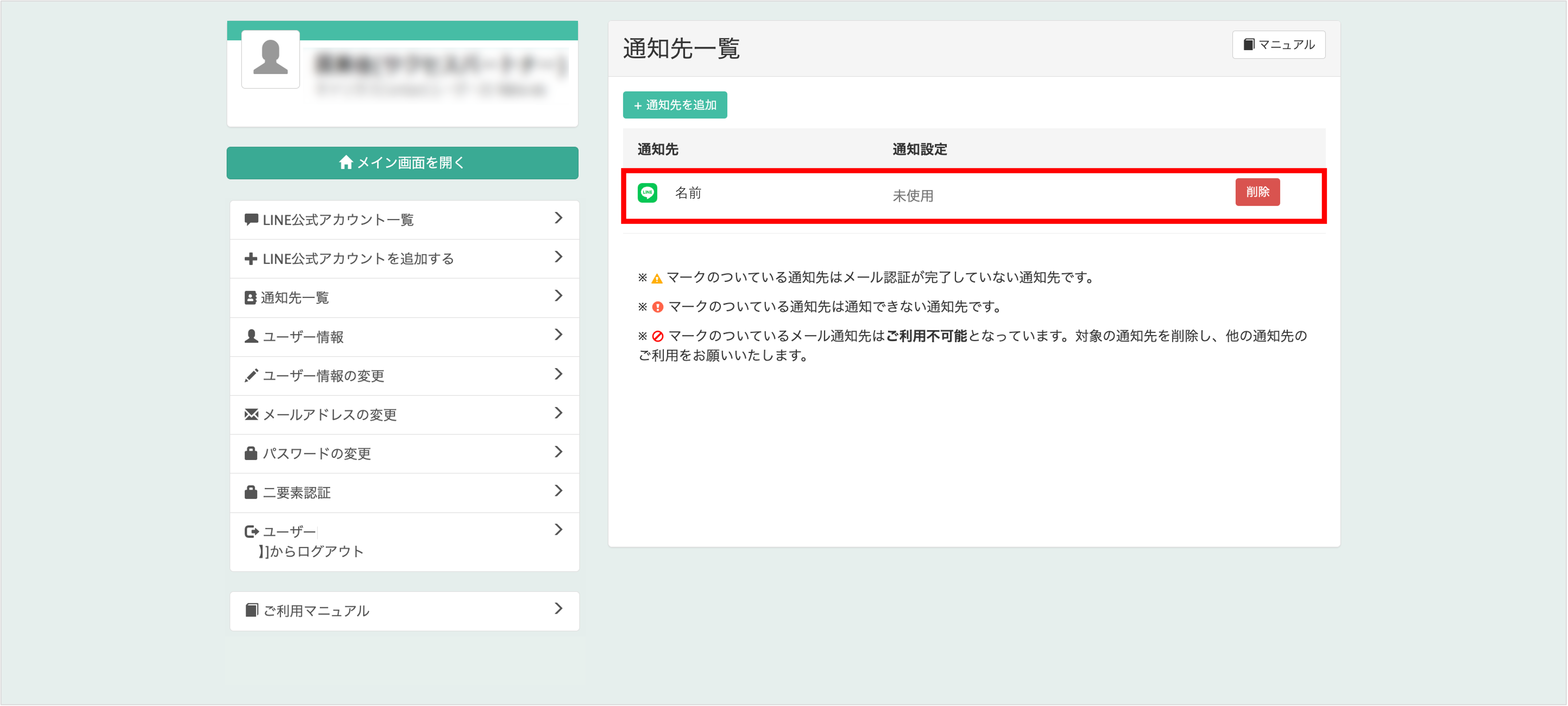 通知先一覧画面を再読み込みすると、登録したLINEアカウントが表示されます。