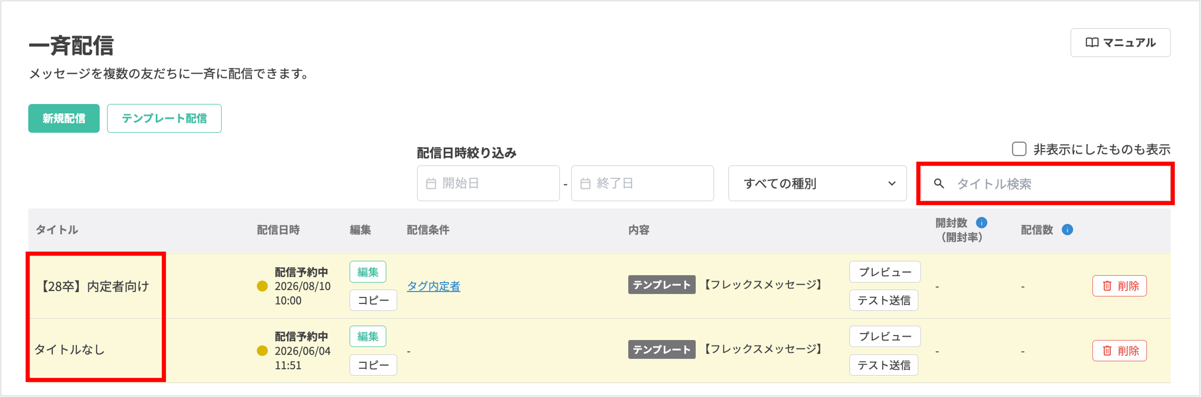 ・配信から2週間以内かつ最終更新日時から1時間未満の一斉配信