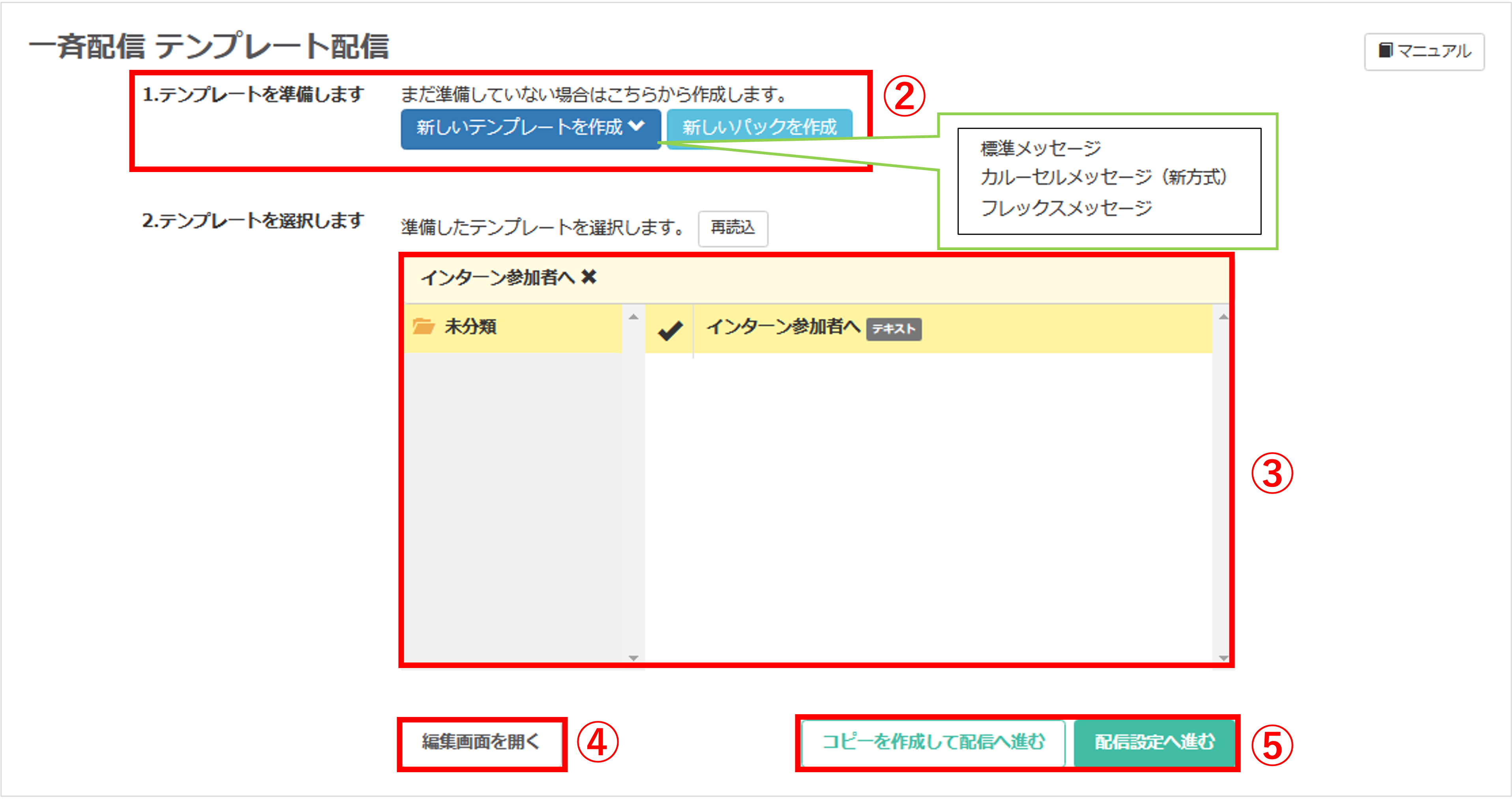 ・配信設定へ進む:元のテンプレートのまま、配信メッセージとして追加することができます。