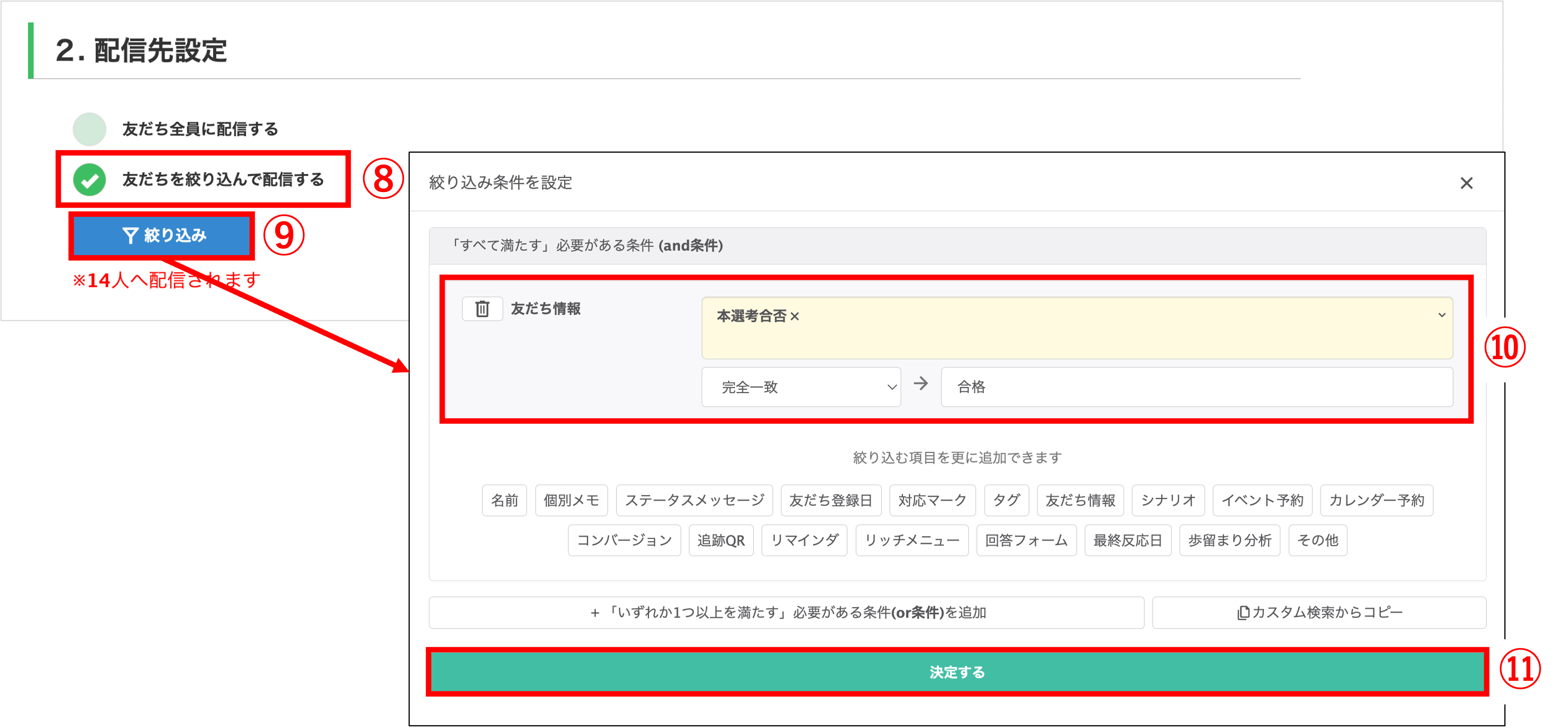 ⑩「準備」で作成しておいた合格者のタグ、もしくは友だち情報を選択します。