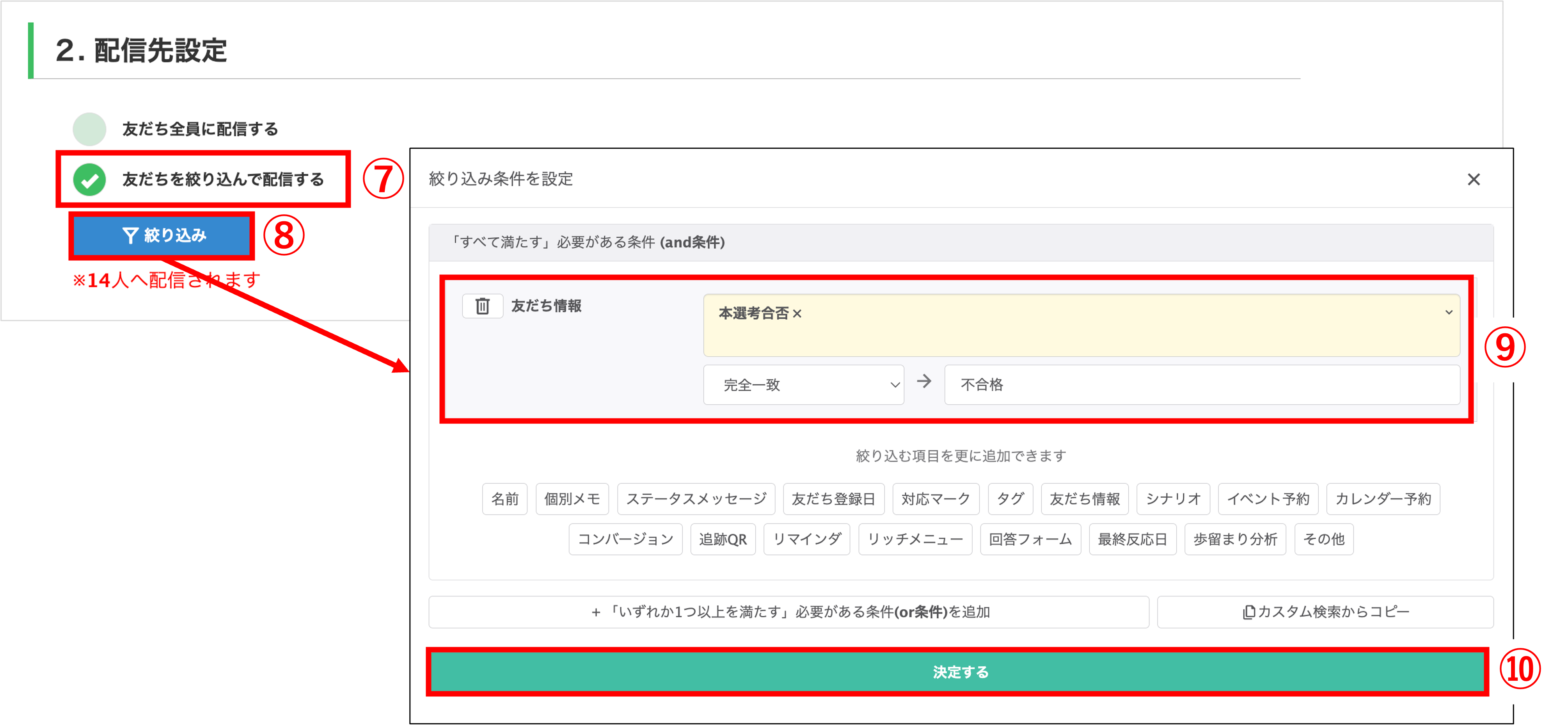⑨「準備」で作成しておいた不合格者のタグ、もしくは友だち情報を選択します。