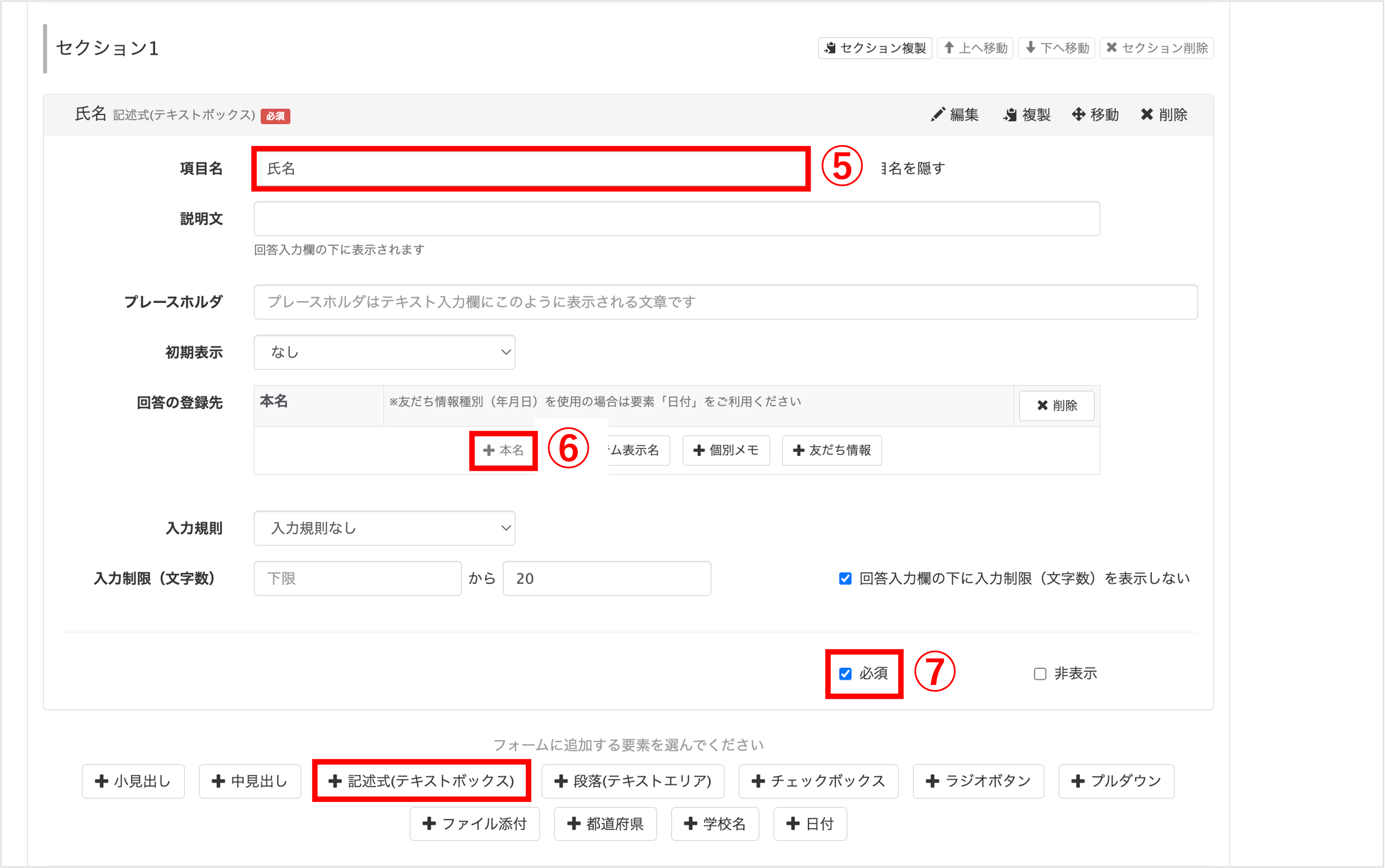 ⑤〔+記述式(テキストボックス)〕ボタンをクリックし、『項目名』に「氏名」もしくは「名前」と入力します。
