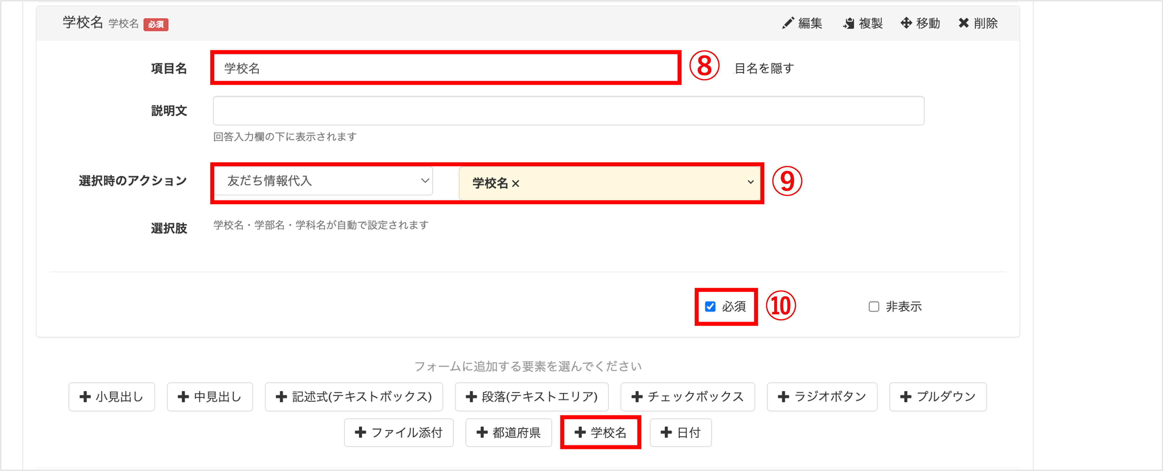 ⑧〔+学校名〕ボタンをクリックし、『項目名』に「学校名」と入力します。