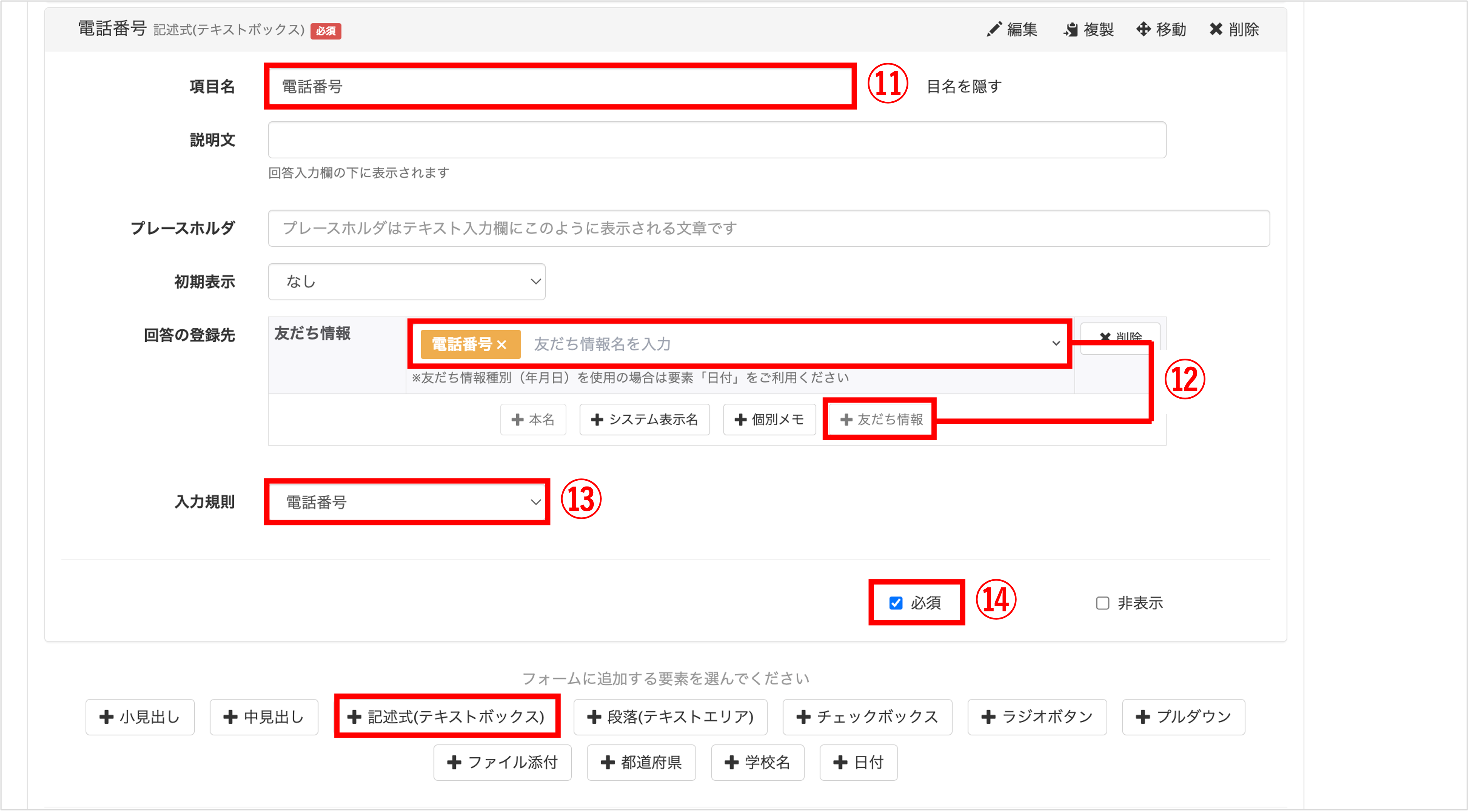⑪〔+記述式(テキストボックス)〕ボタンをクリックし、『項目名』に「電話番号」と入力します。