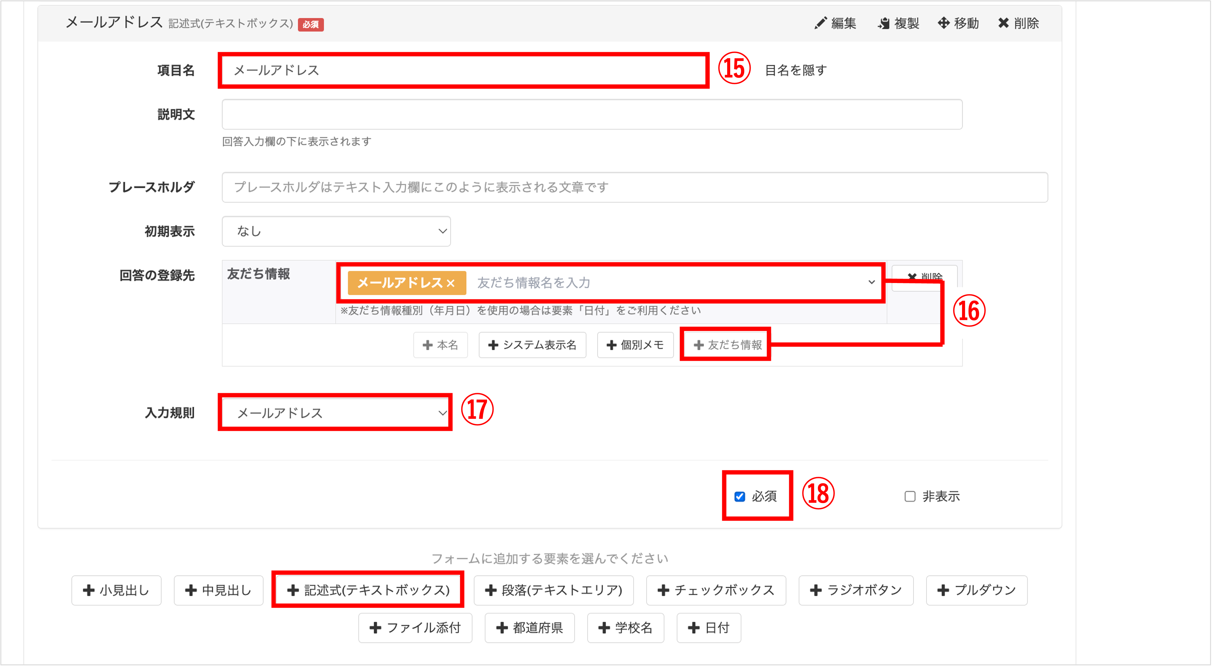 ⑮〔+記述式(テキストボックス)〕ボタンをクリックし、『項目名』に「メールアドレス」と入力します。