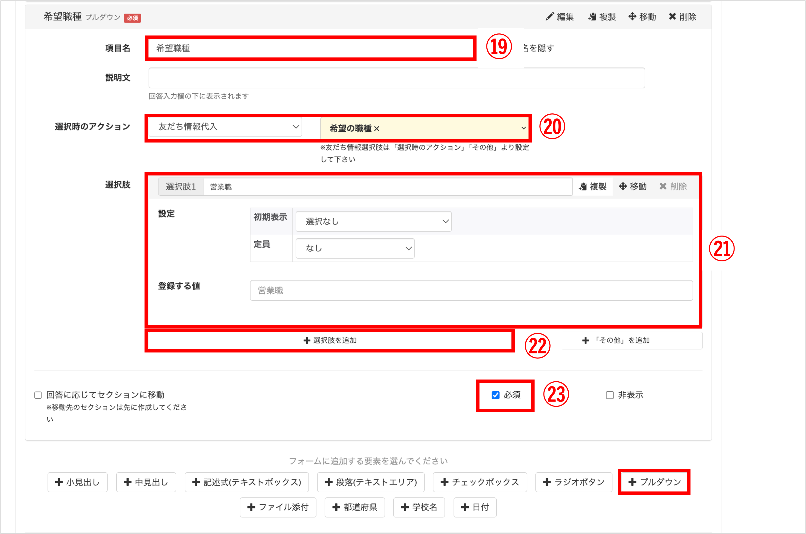 ⑲〔+プルダウン〕ボタンをクリックし、『項目名』に「希望職種」と入力します。
