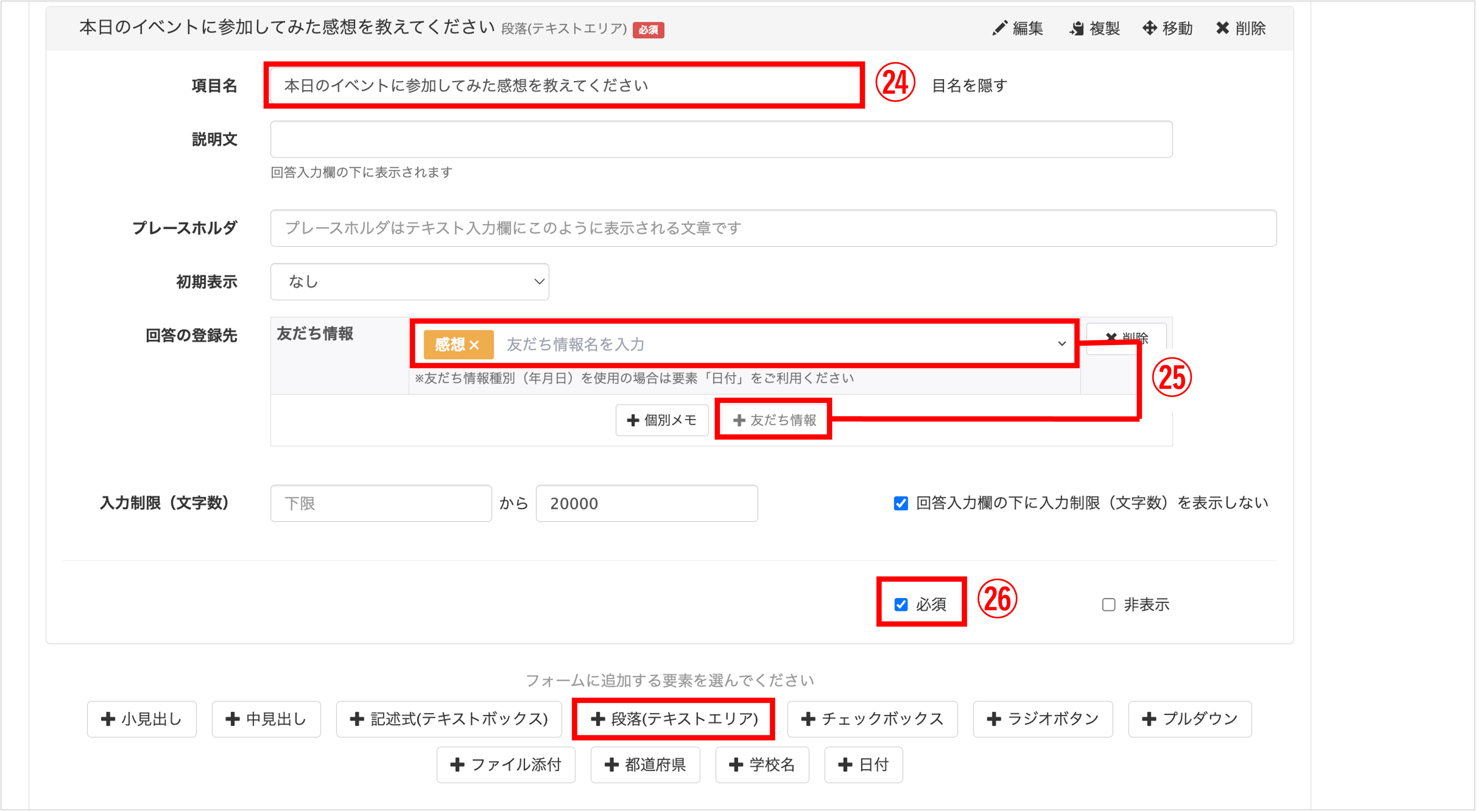 ㉔〔+段落(テキストエリア)〕ボタンをクリックし、『項目名』に「本日のイベントに参加してみた感想を教えてください」などと入力します。