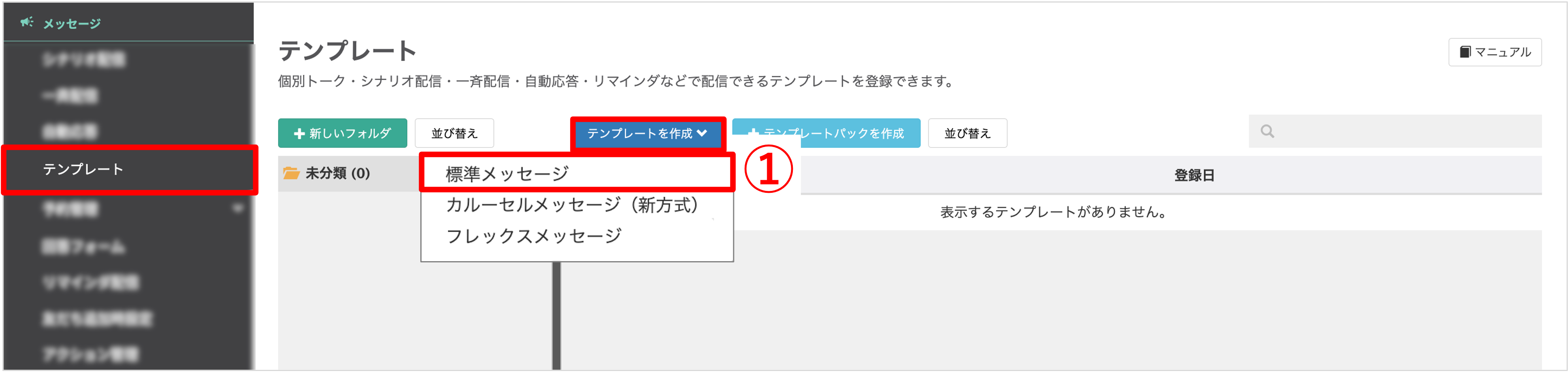 ①〔テンプレートを作成〕>「標準メッセージ」をクリックします。