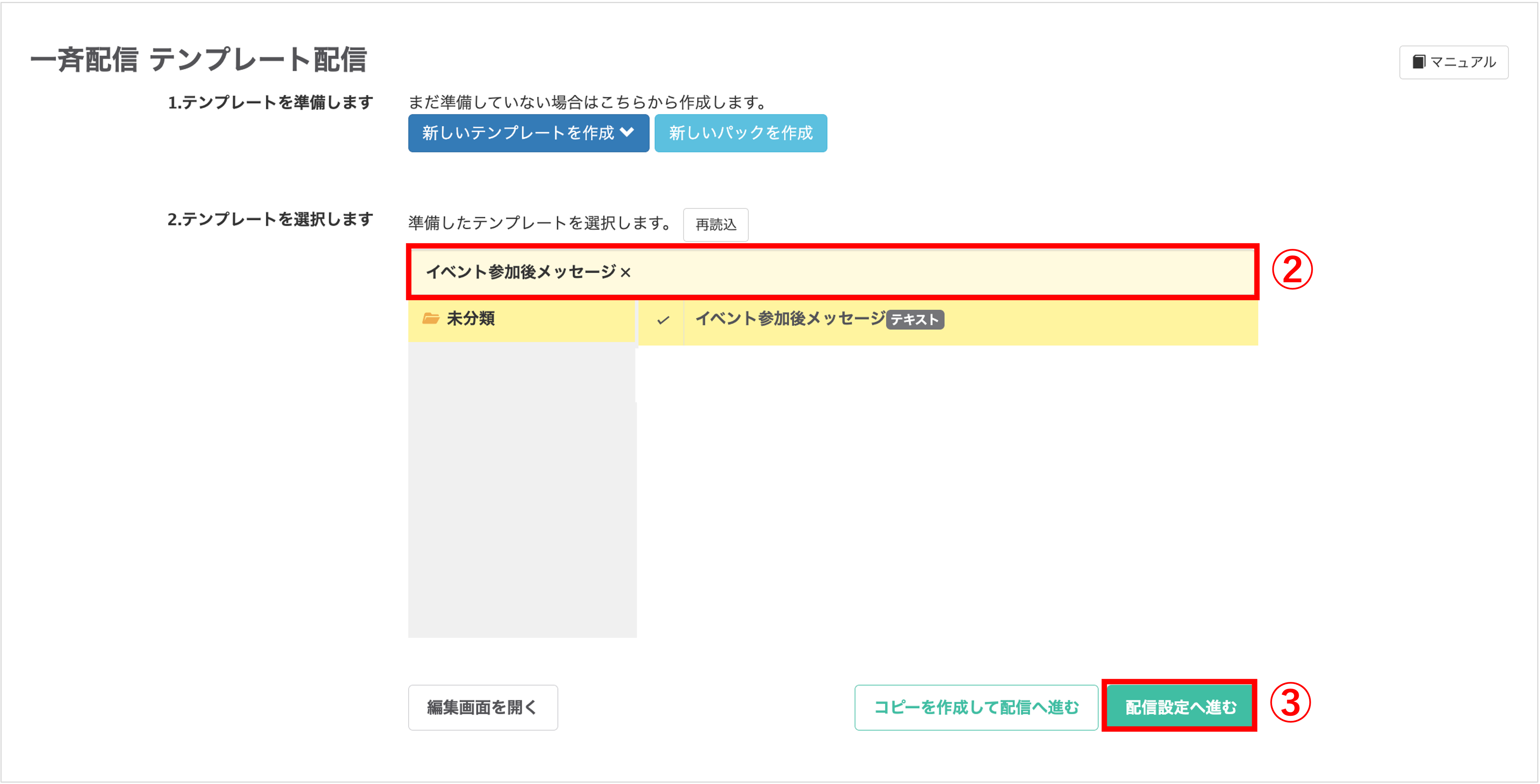 元のテンプレートを変更したくない場合は、③で〔コピーを作成して配信へ進む〕ボタンをクリックして配信設定を行ってください。