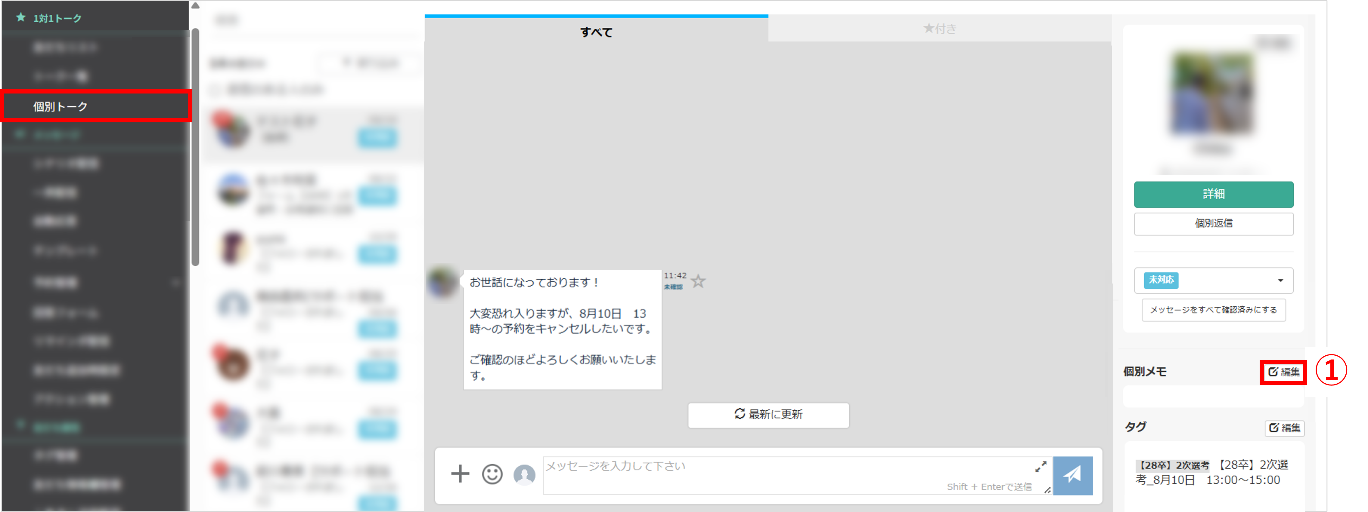 ①キャンセルの連絡があった友だちの個別トーク画面を開き、個別メモ欄の右側にある〔編集〕ボタンをクリックします。
