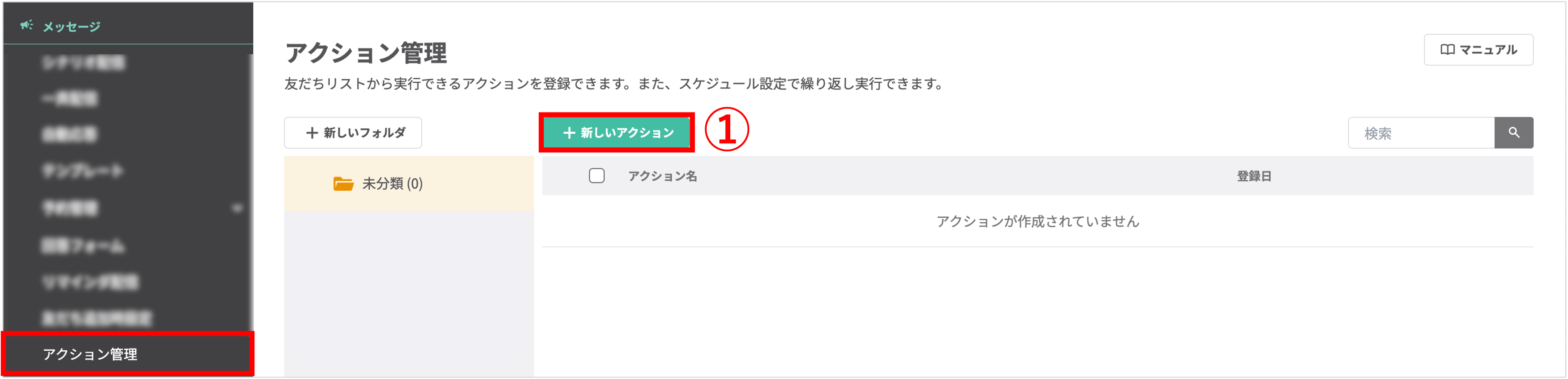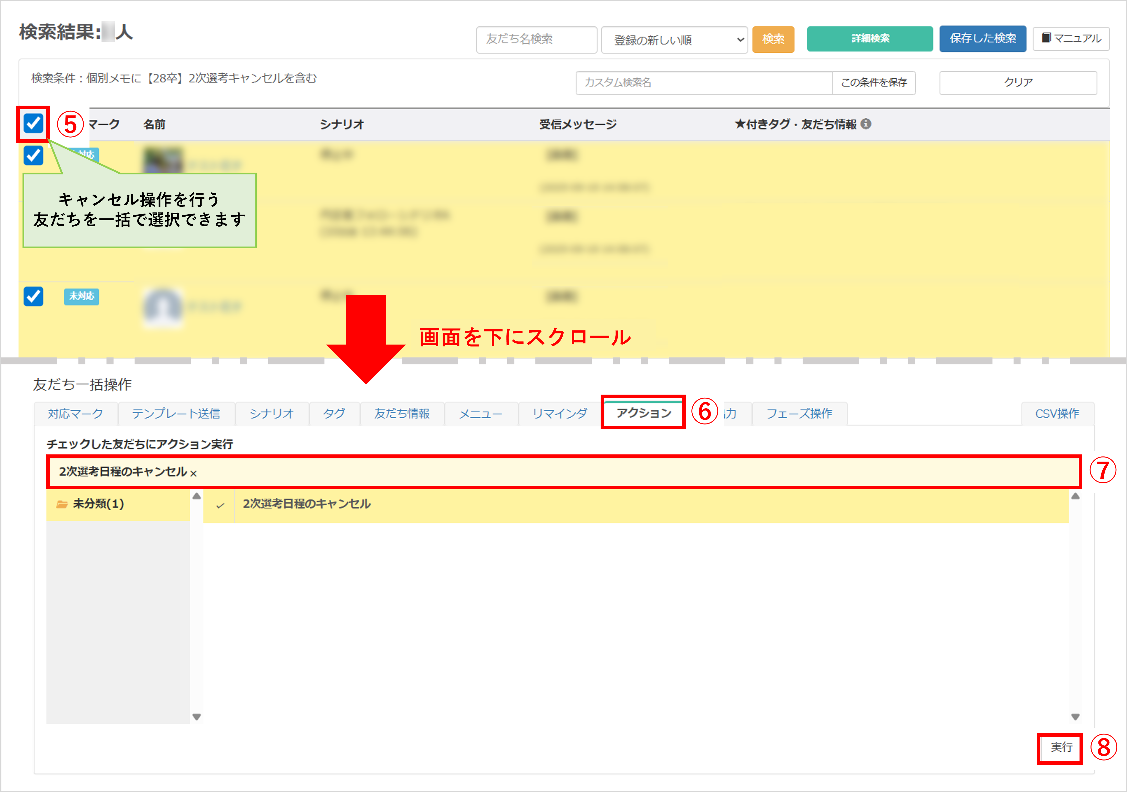⑥画面を下にスクロールし、『友だち一括操作』で『アクション』タブに切り替えます。