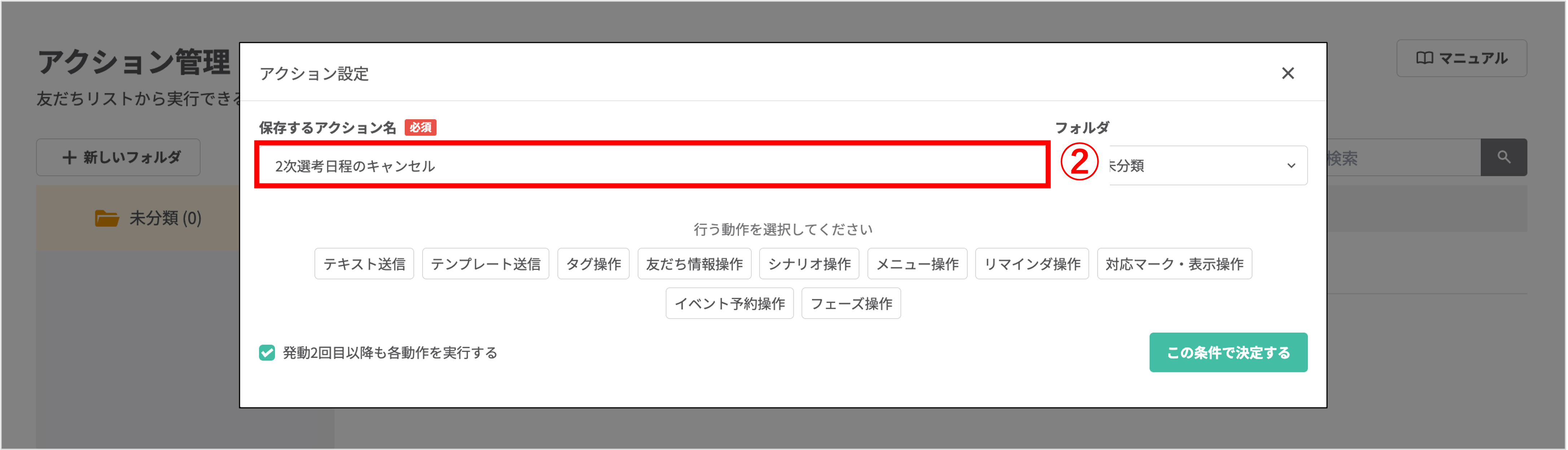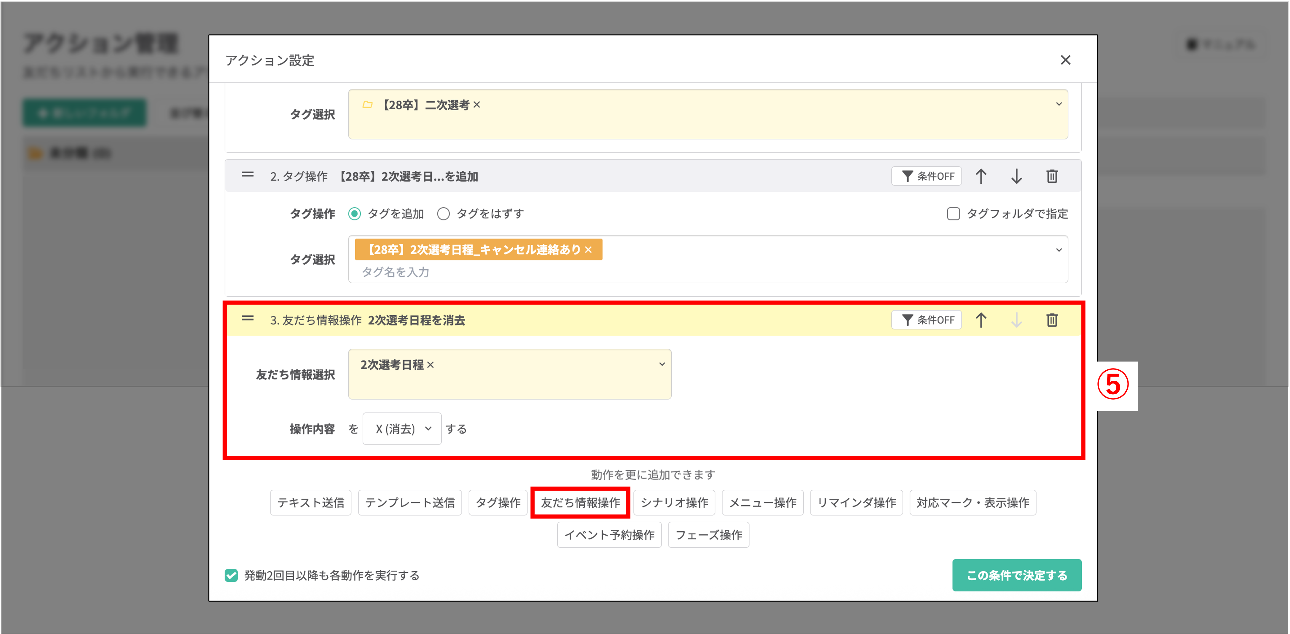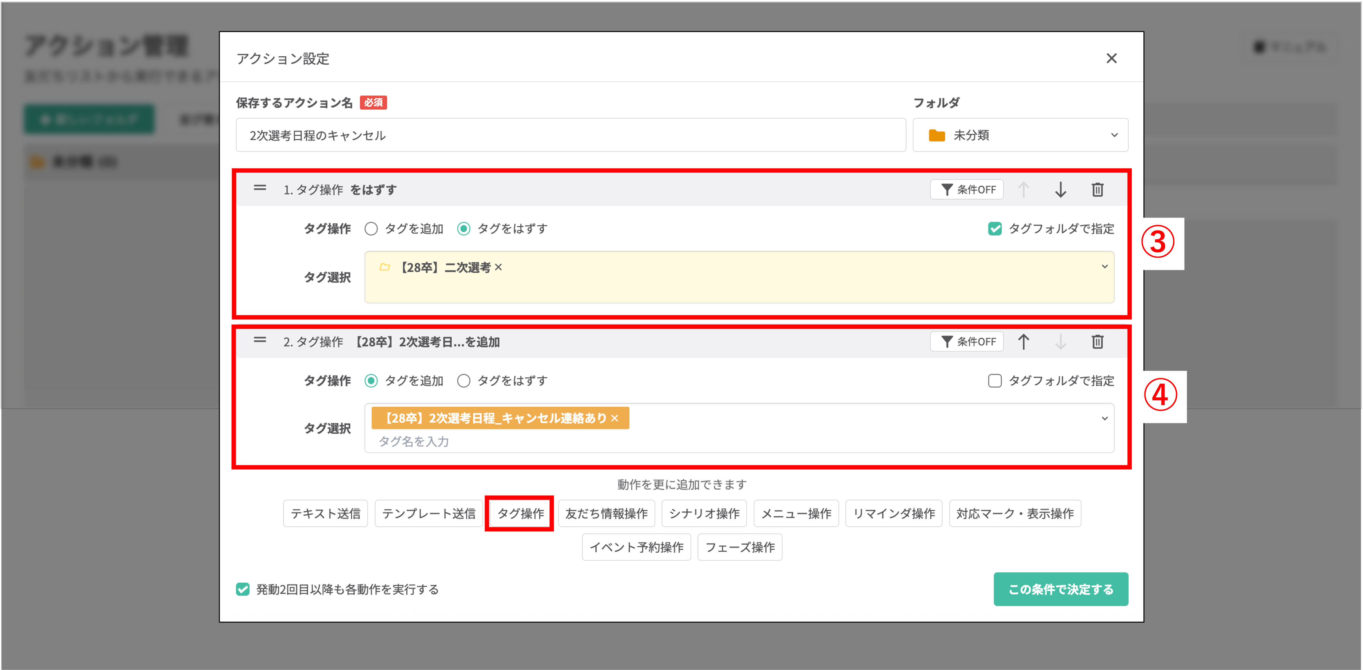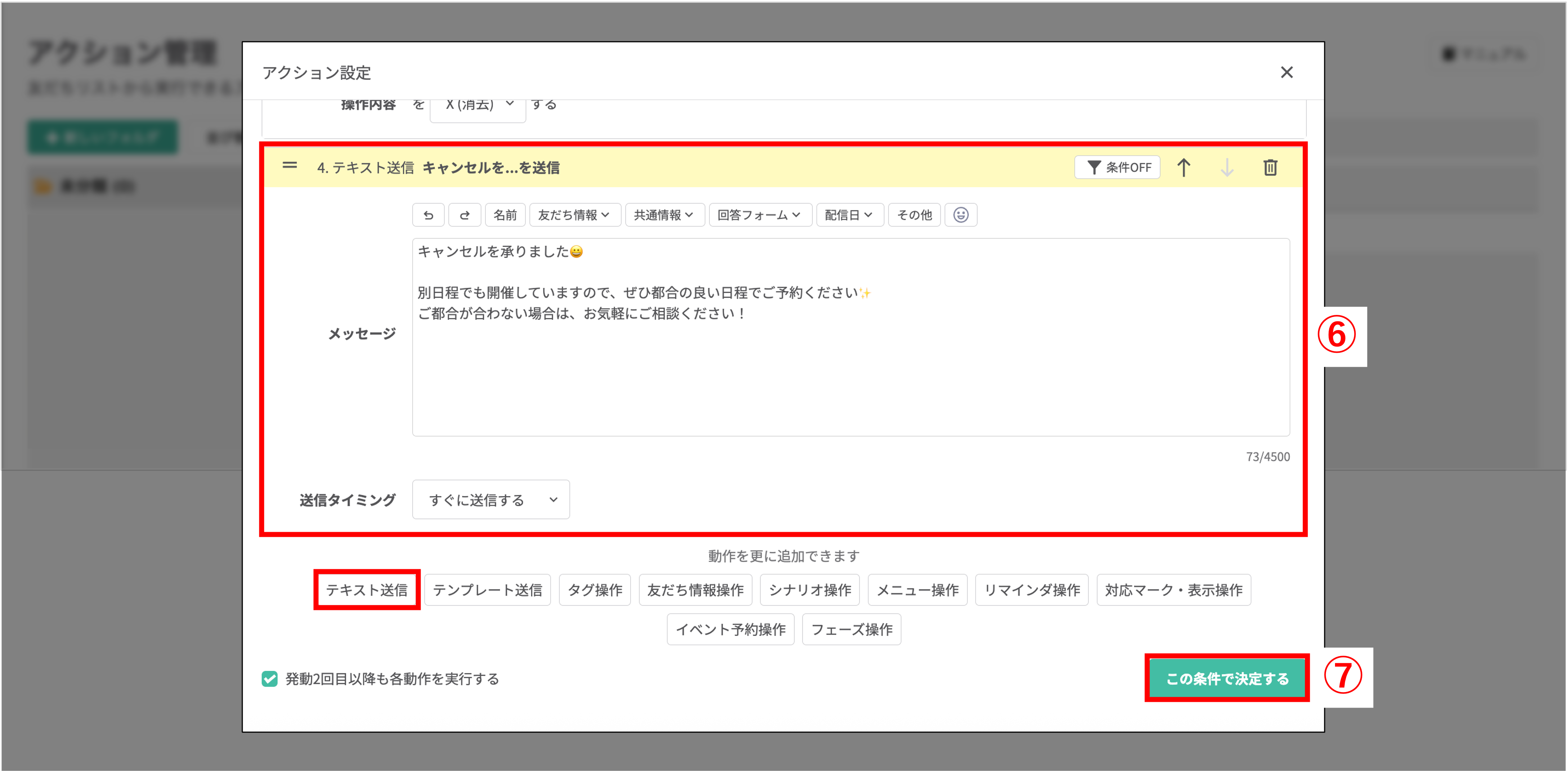 ⑦〔この条件で決定する〕ボタンをクリックすると、キャンセル時に実行する一連のアクションが登録されます。