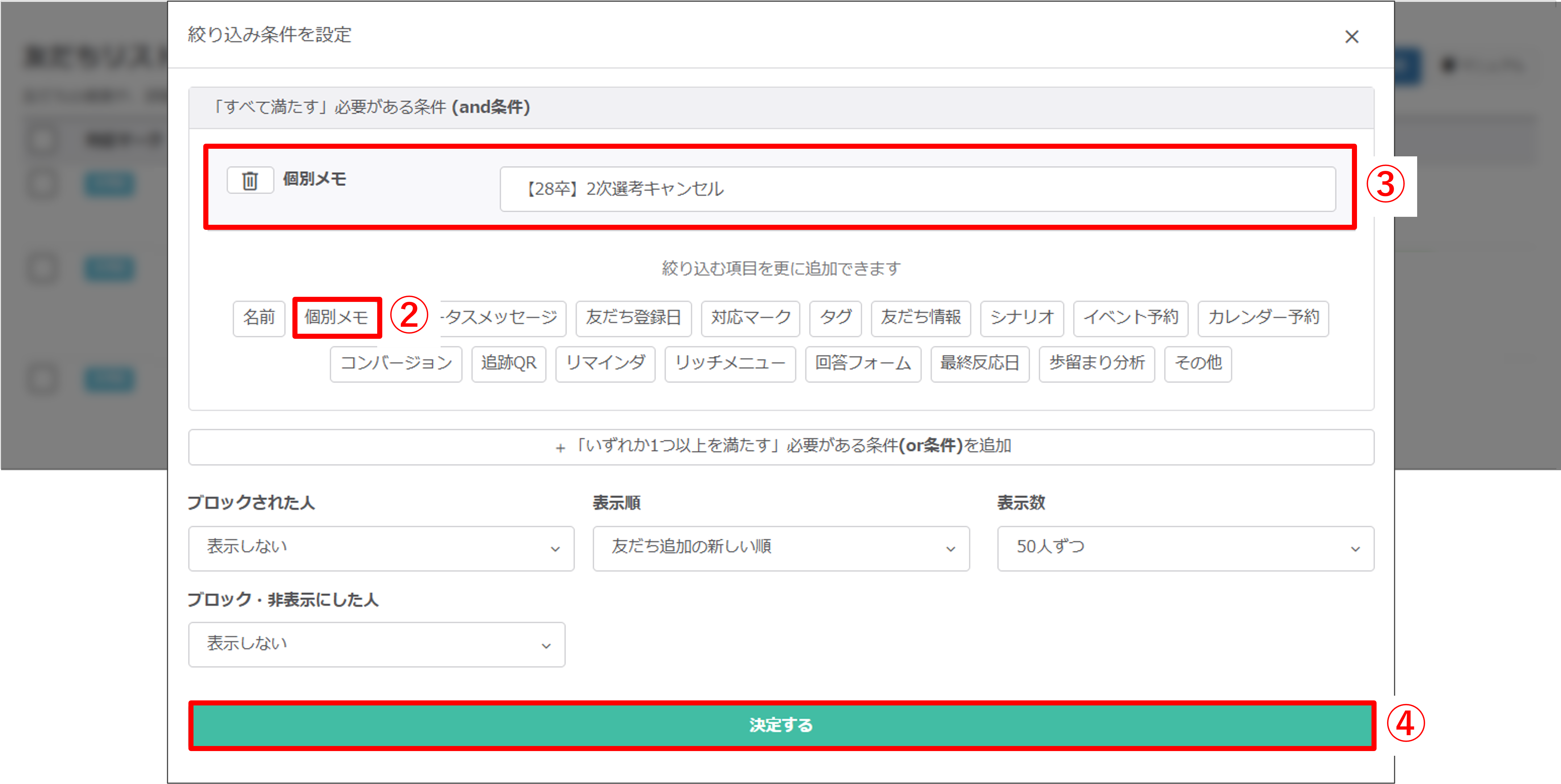 →該当する文字列(【28卒】2次選考キャンセル)を含む個別メモが登録されている友だちを絞り込むことができます。
