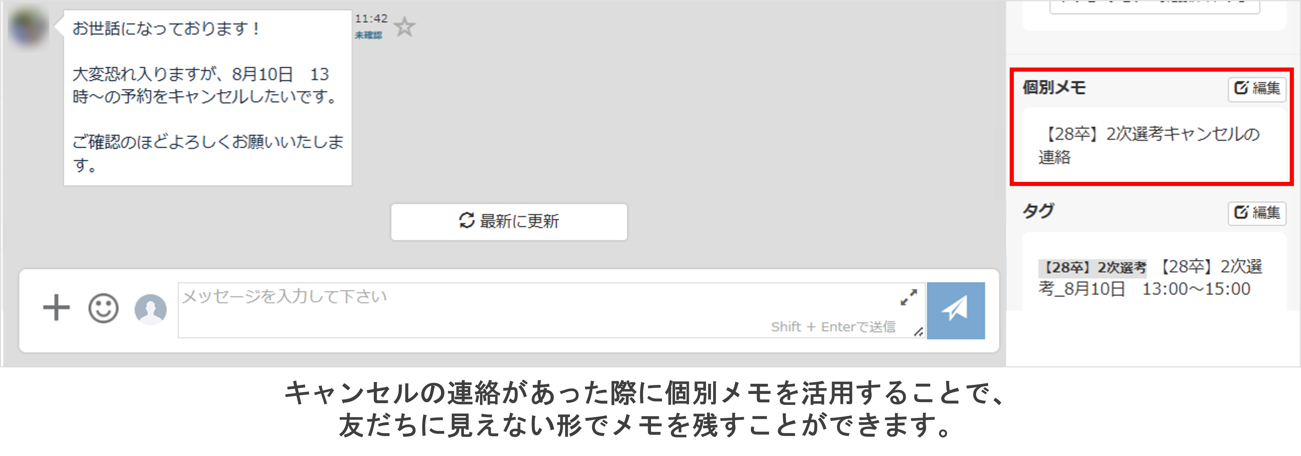 ★キャンセルの連絡があった友だちに対して、「個別メモ」にメモを残す方法を解説します。