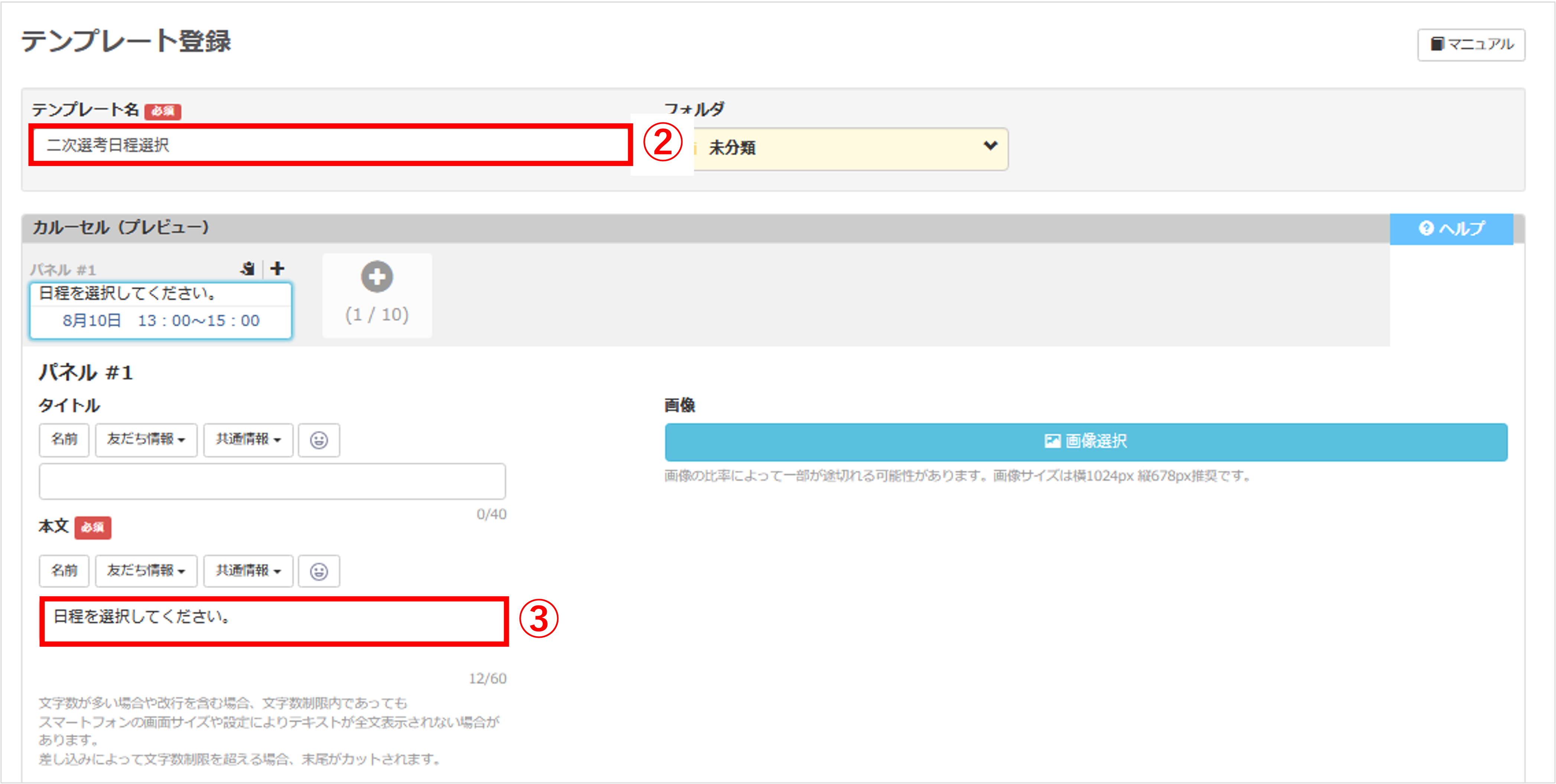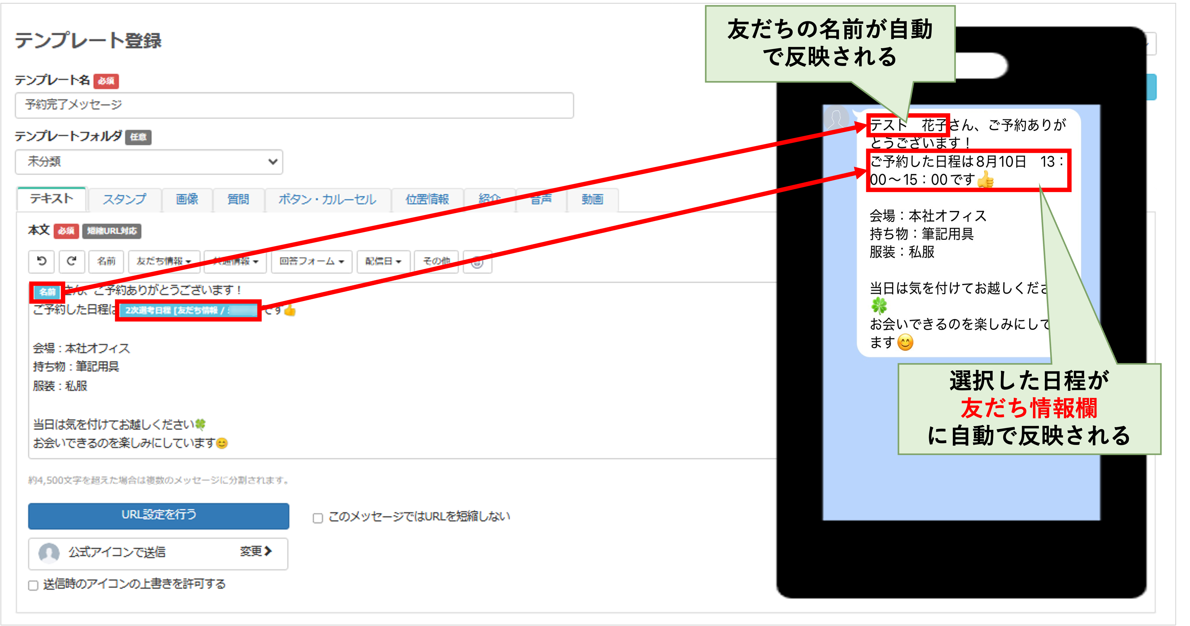 ★「次回選考日程」の友だち情報を作成し、友だちが日程を予約したときに日程が登録されるように設定しておくと、メッセージ内に友だちが予約した日程を自動で反映することができます。